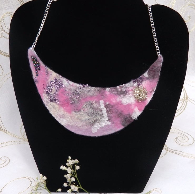 Made from hand felted soft merino wool, this necklace is a gorgeous addition to a number of outfits. It has a securely fastened silver coloured chain with a silver colour crushed jewellery wire accent and purple coloured seed beads. It is light and comfortable to wear and made incorporating shades of Radiant Orchid, the pantone colour of the year it is set to be a real conversation piece for a wedding or Summer outfit.