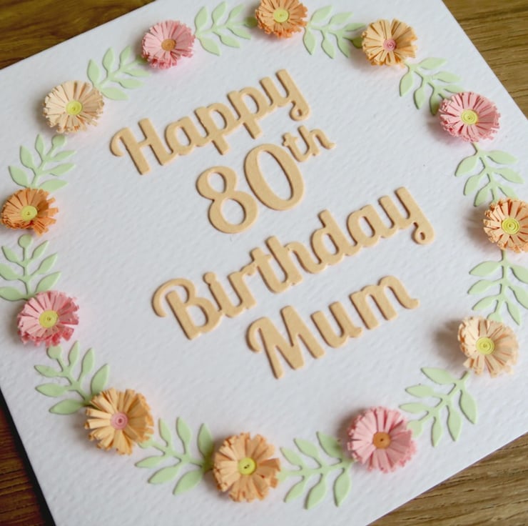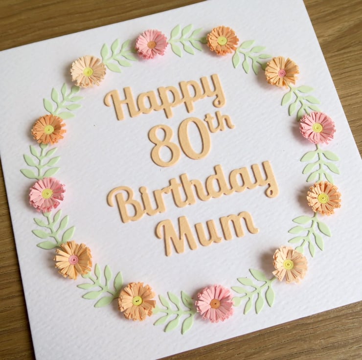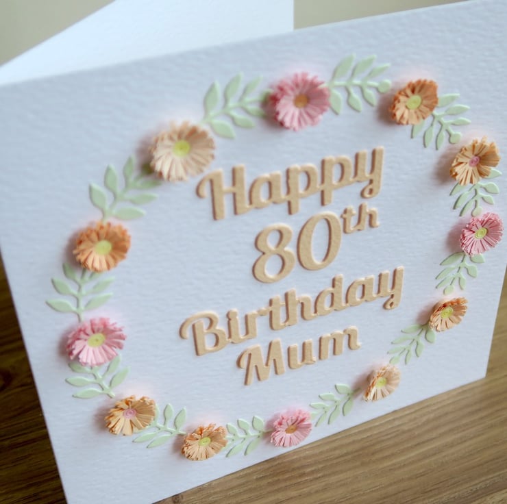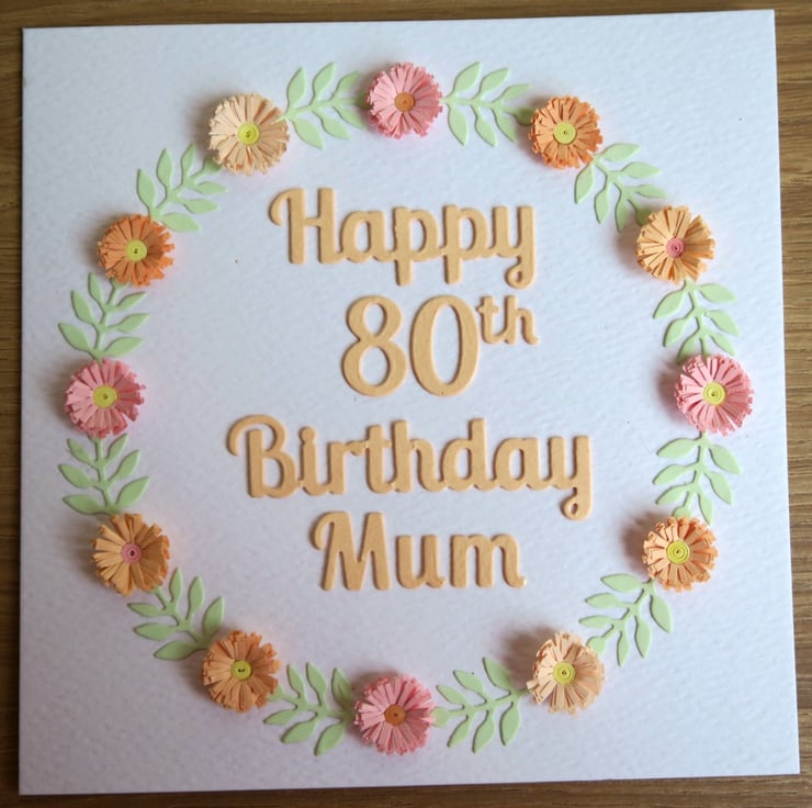 A beautiful paper quilling 80th birthday card with quilled flowers in pretty shades of pink and peach for a very special person, which can be personalised with any age and name. The card shown says "Mum" but this can be any other name, and any number can be added. Leave me a note at the checkout, or send me a message via Folksy, to let me know the details for your card. This design is available in a range of other colourways - please see my other listings or contact me.