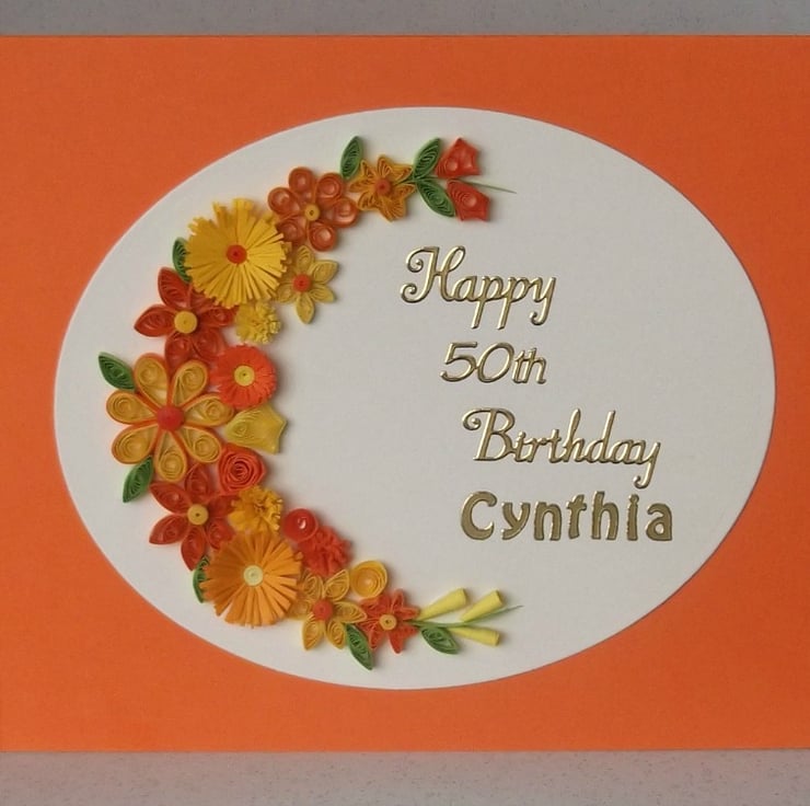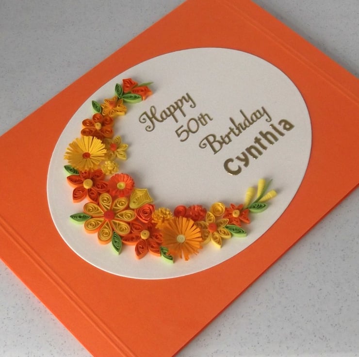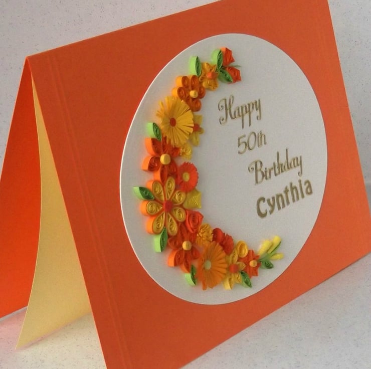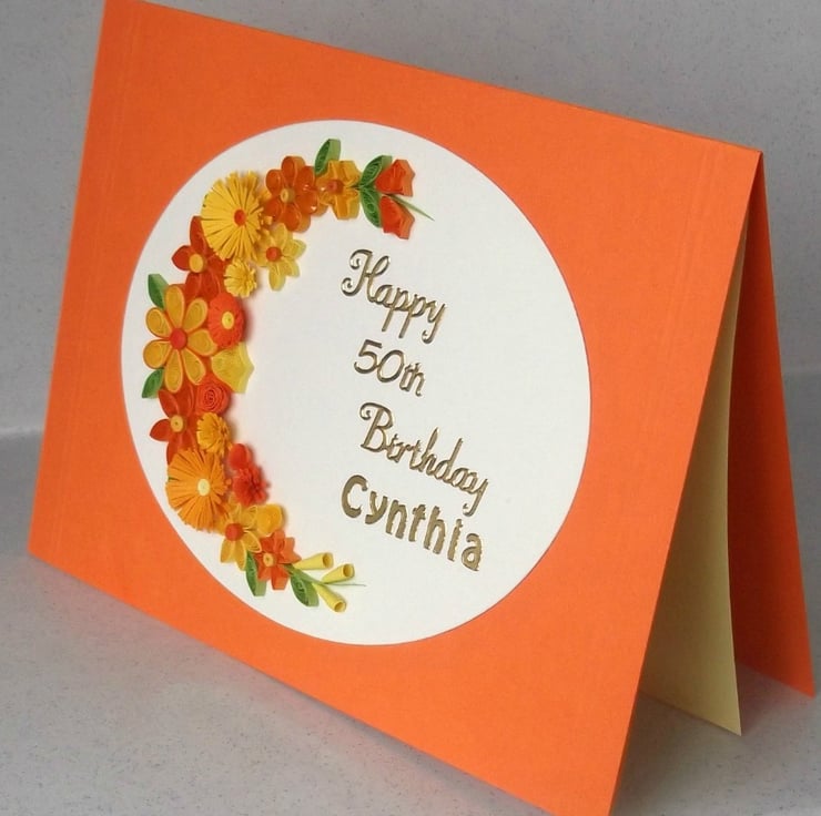 Handmade quilled 50th birthday greeting card. This card can be made for any special birthday and with any name - just let me know what you need by leaving a note at the Paypal checkout or send me a message.