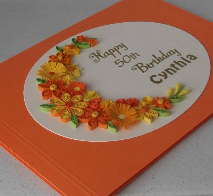 A beautiful quilled card with quilling flowers in bright orange shades for a very special person.