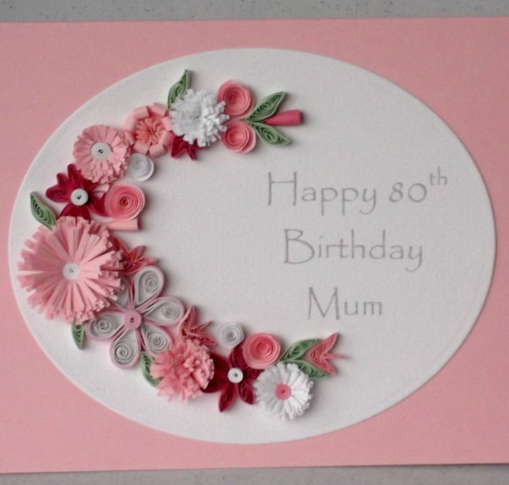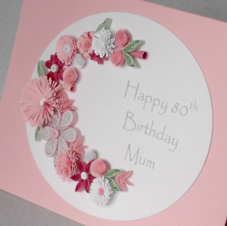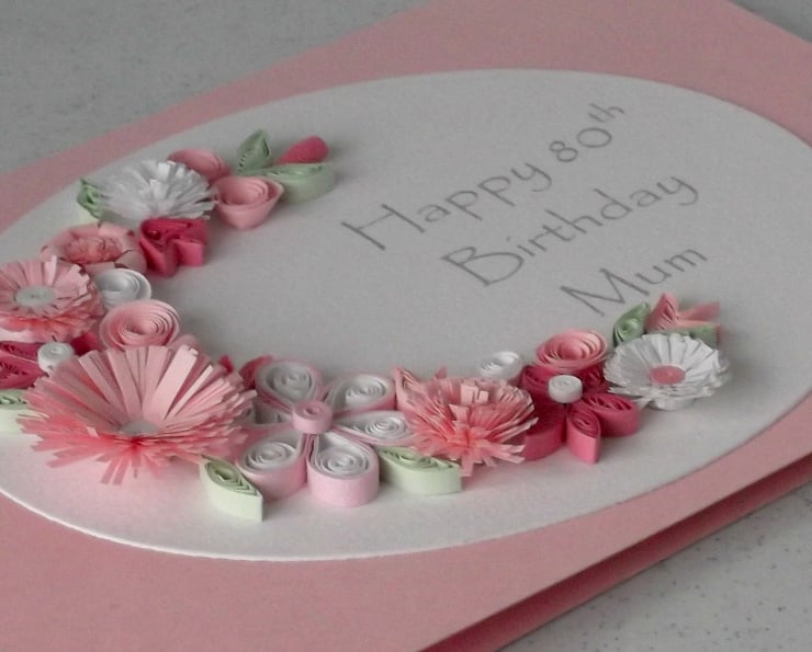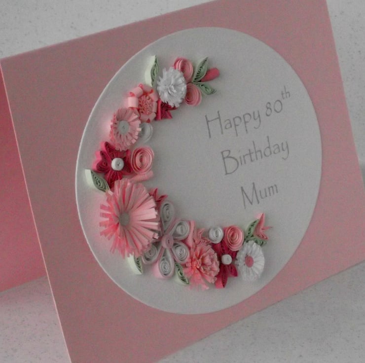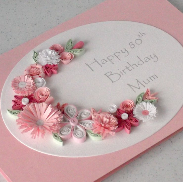 A beautiful quilled birthday card with quilling flowers in shades of pink, perfect for sending special birthday wishes. I can personalise the message for any birthday and any recipient - just let me know what you need as you check out.