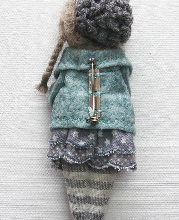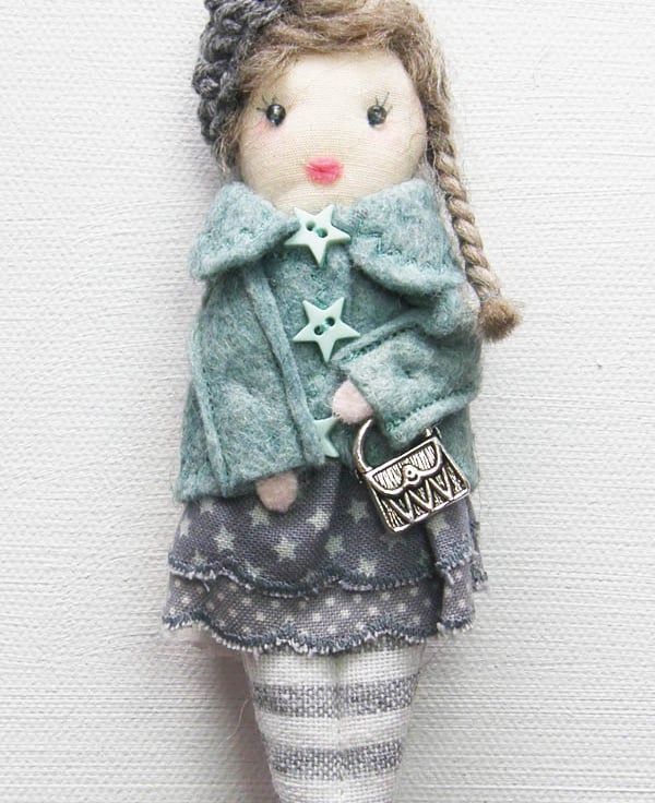 This little girl Florrie, is a rag doll brooch, she stands just 11.5 cm tall and is made to my own pattern. She has grey seed beads for eyes and button joints for her arms. Her hair is wool tops and she has a tiny hat. She is wearing a tiny felt coat with matching buttons and full skirt in co-ordinating greys and green and carries a teeny silver coloured hand bag. She has a brooch back and sits nicely on coats and hand bags.