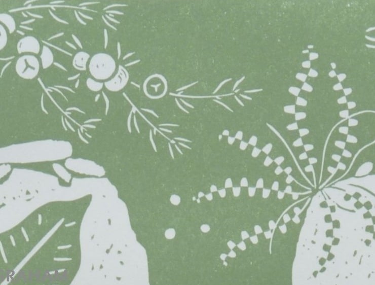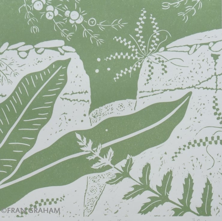 In this original lino print I have stylised Juniper, Hart's tongue fern, Maidenhair spleenwort and the rare Holly fern to convey the flora of limestone pavements above Crummack Dale, in the Yorkshire Dales National Park.
