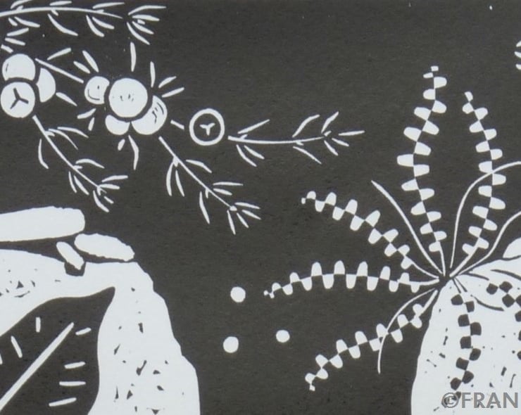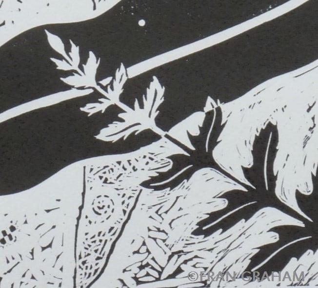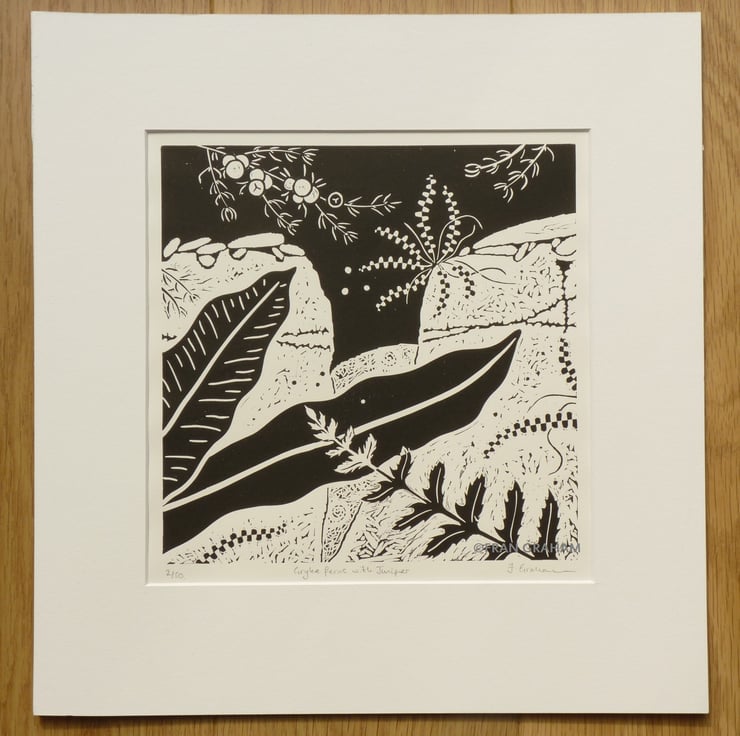 In this original lino print I have stylised Juniper, Hart's tongue fern, Maidenhair spleenwort and the rare Holly fern to convey the flora of limestone pavements above Crummack Dale, in the Yorkshire Dales National Park.