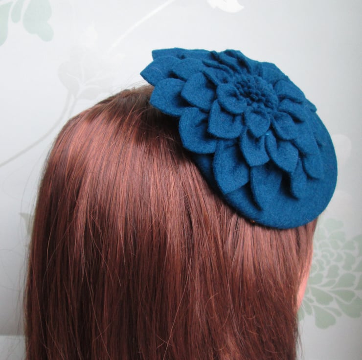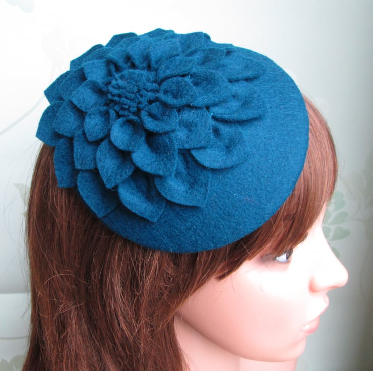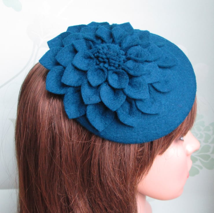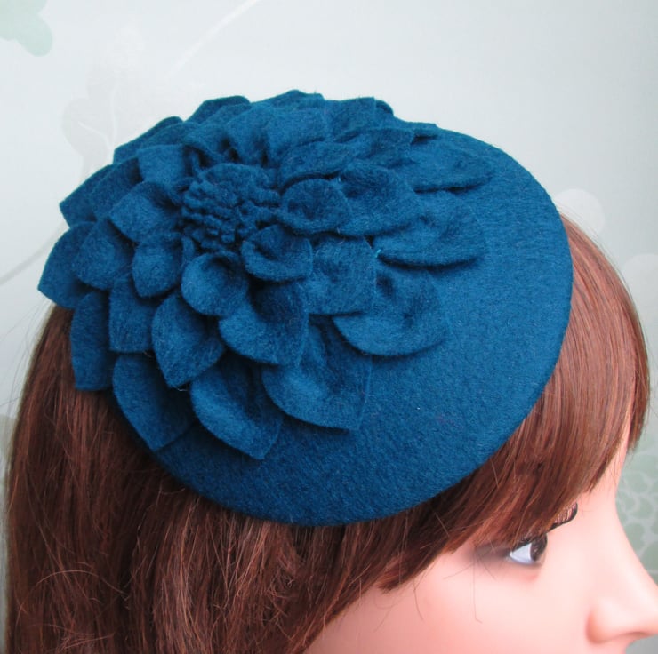 Teal hat handmade from pure wool felt. The flower is mounted onto a felt covered base (14cm diameter) to create a lovely petite style cocktail hat which is very popular for 'vintage' weddings or for those looking for something a bit different from high street offerings.