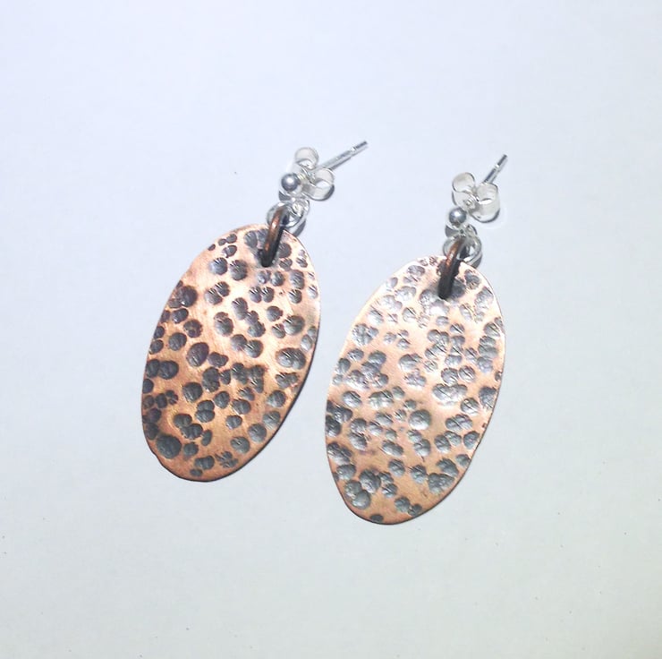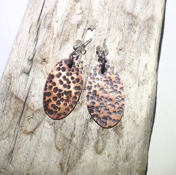 These beautiful copper earrings are hand-sawed from sheet copper, textured by hammer and oxidised then sanded back to produce the attractive organic 'animal print' style effect (the backs have been left dark). The copper jump ring has been soldered and the earrings.