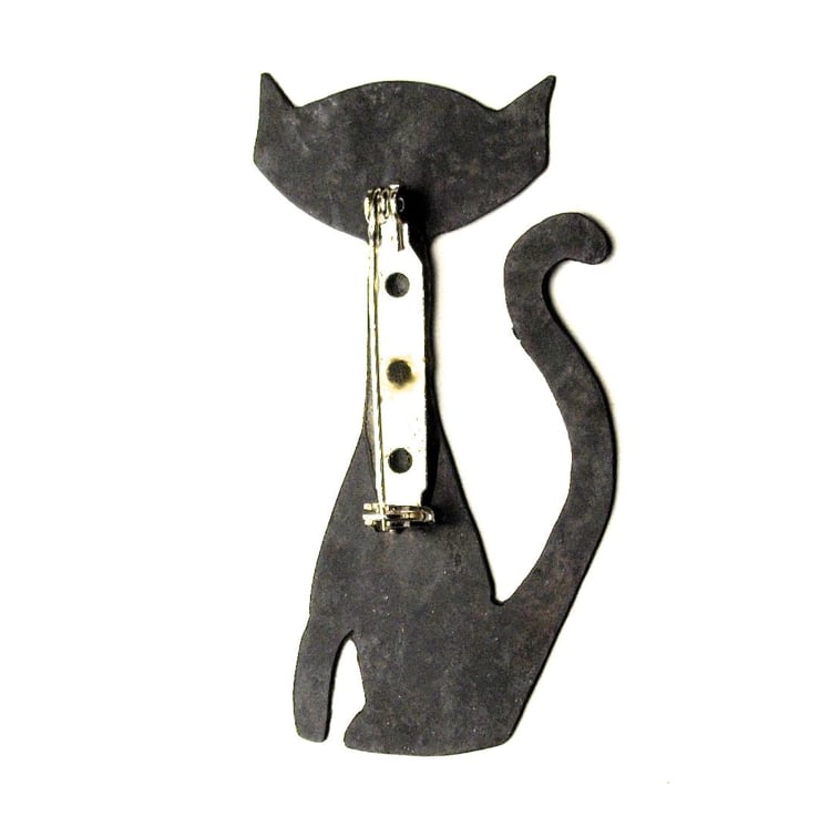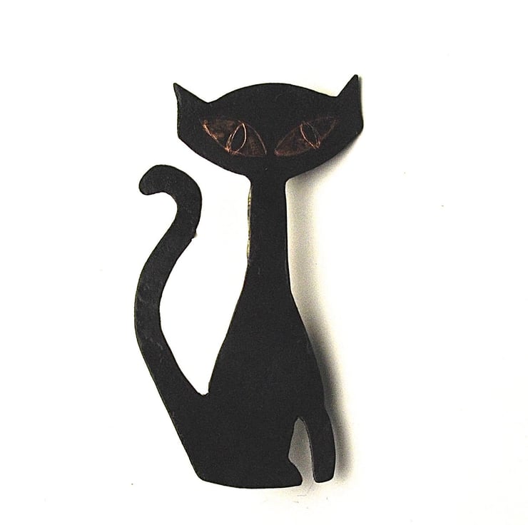 This cute cat brooch is hand sawn from copper sheet in a retro design and then oxidised black. The eyes have been picked out to allow the copper to shine through, it has then been lacquered and a silver plated brooch back with a roll over clasp has been attached to the back.