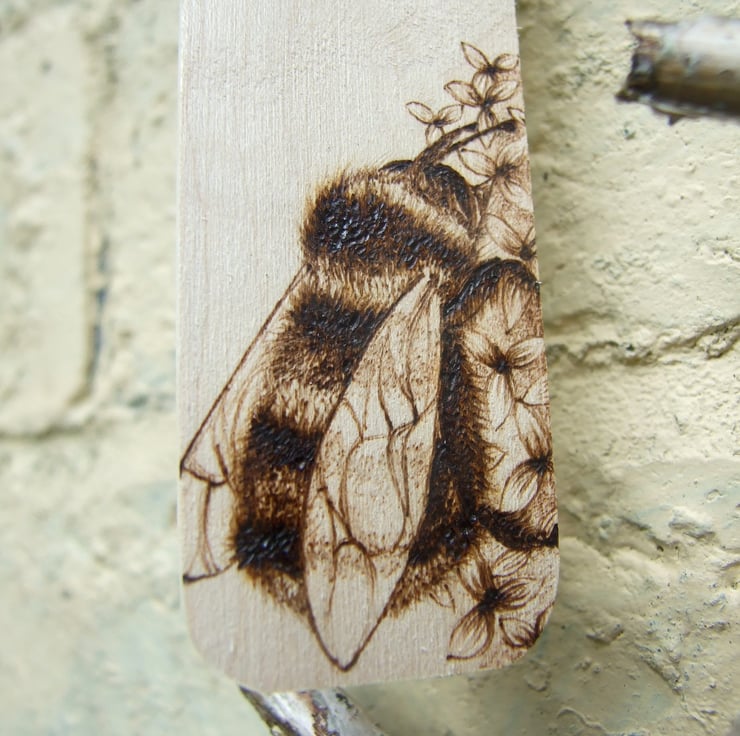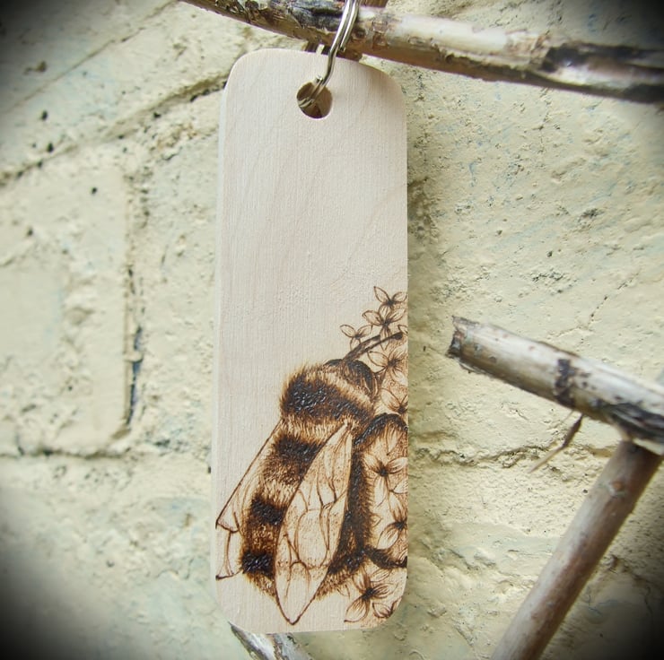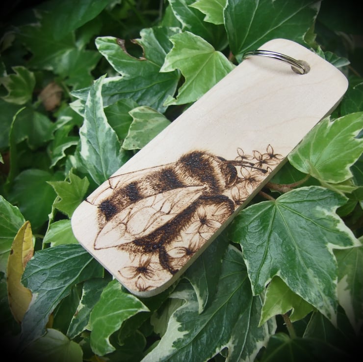 Pyrography is a method of decorating items using a heated tool. This listing is for a chunky wooden keyring decorated with a bumble bee, it is made and ready to post. I can put a name and/or date etc. on the front/reverse. Please see the images for the many variations.