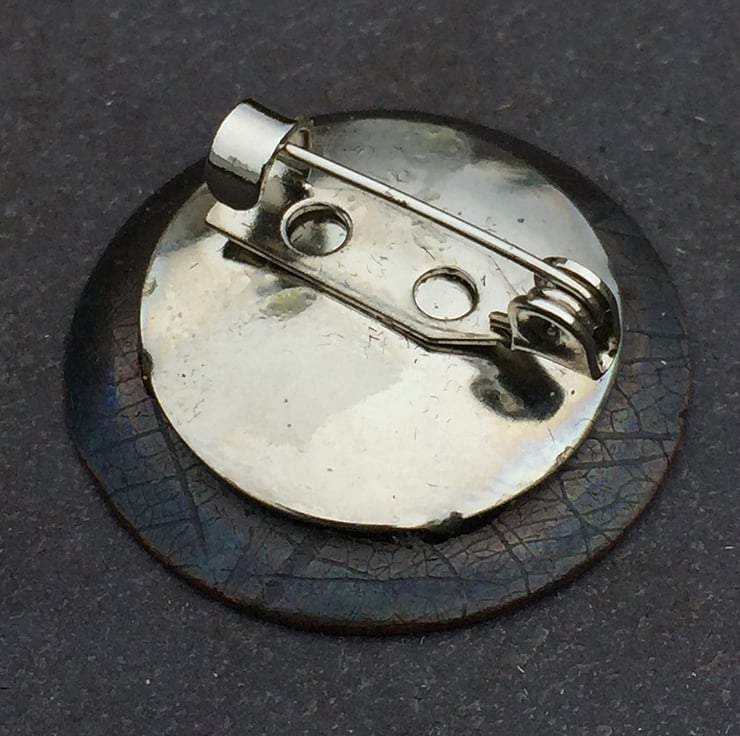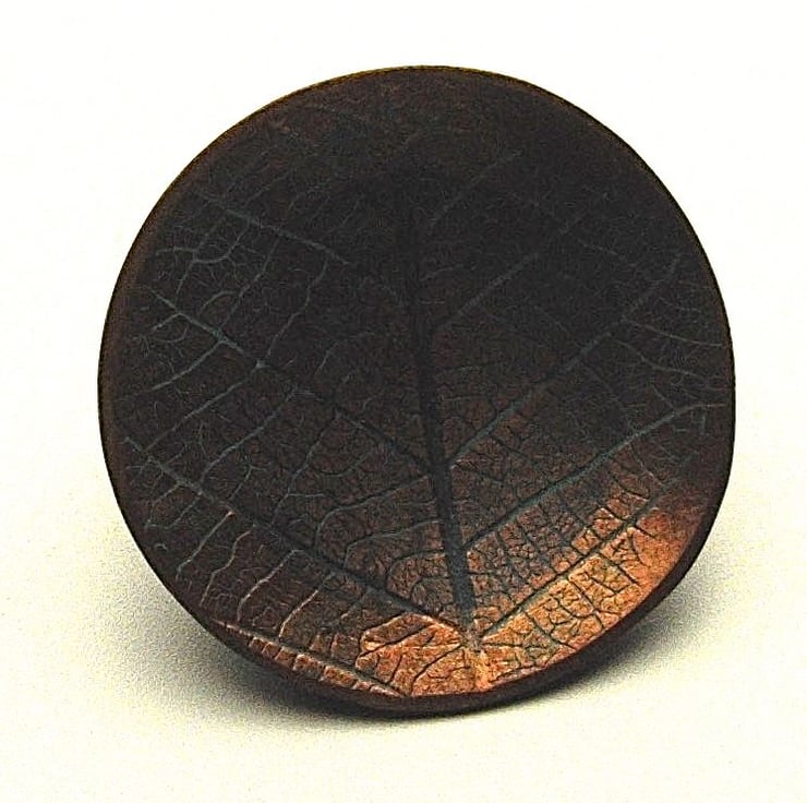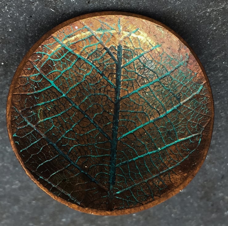 This brooch is hand made from sheet copper which has been imprinted with a skeleton leaf, cut to a circular shape, shaped and then parially oxidised in the centre with a green tint polish applied for a subtle effect.