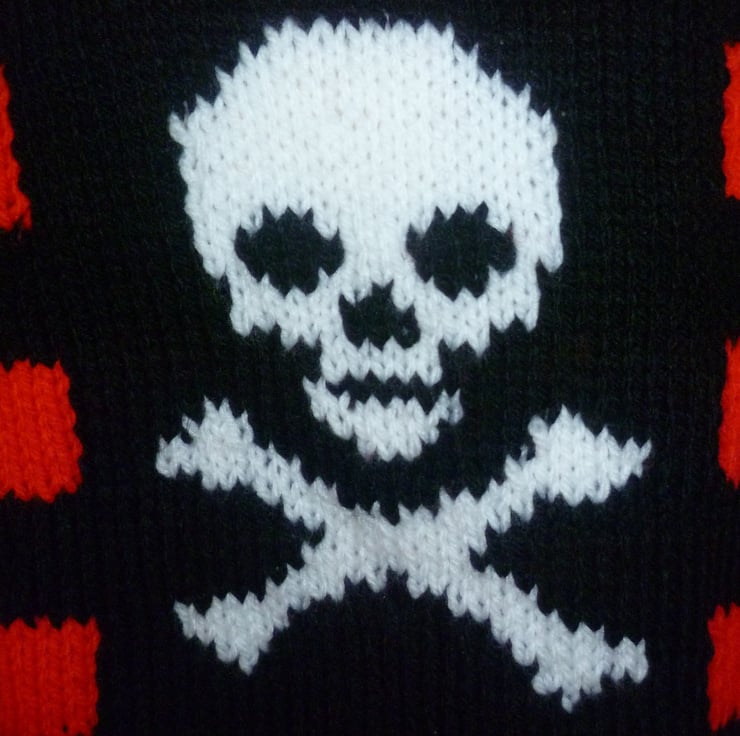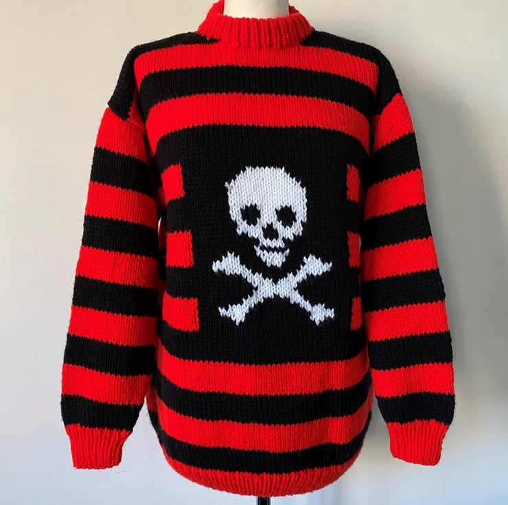 I am inspired by mixing things up which led me to create a Dennis the Menace type jumper with a skull and intertwined white crossbones for a more gothic look
