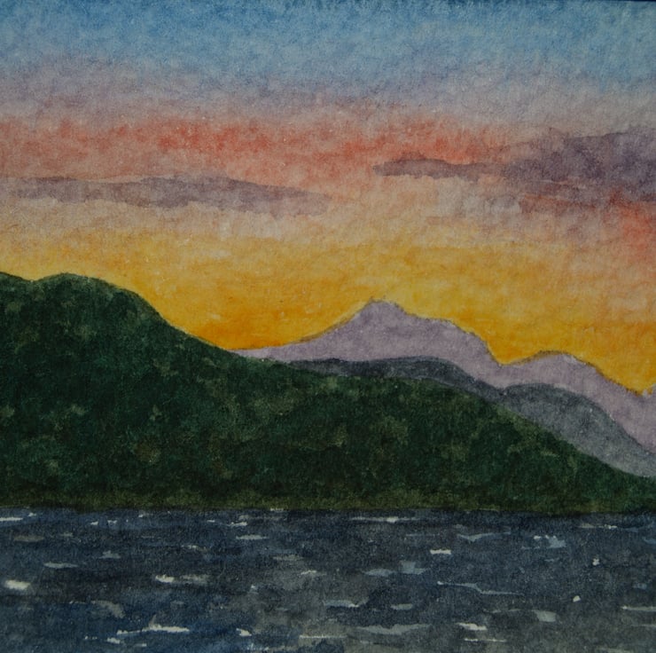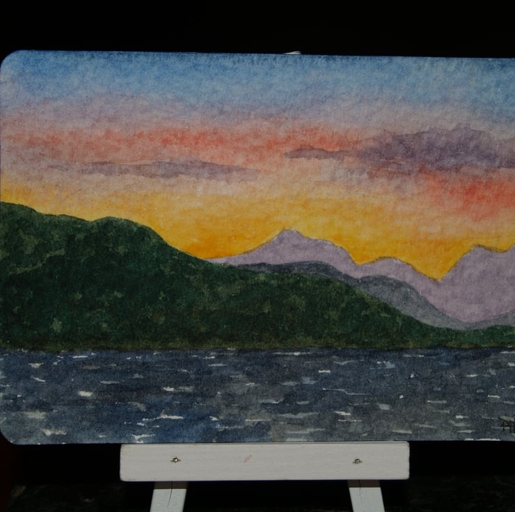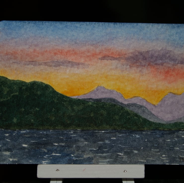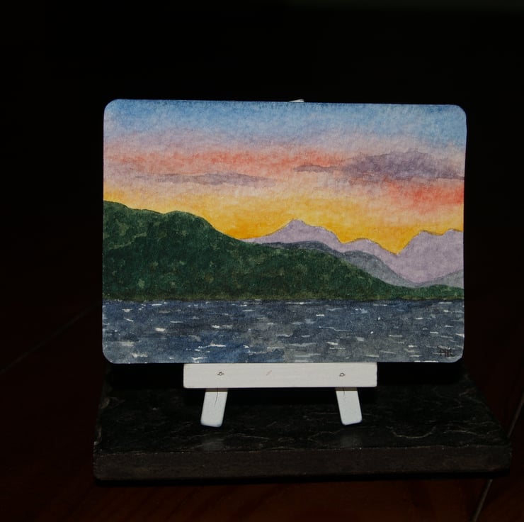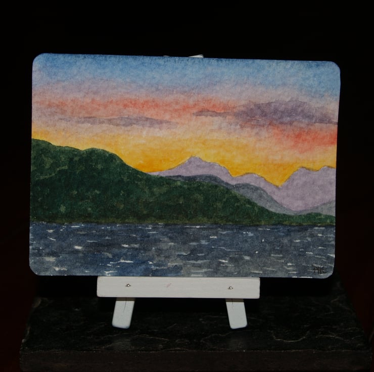 This ACEO is an original, handpainted watercolour of a sunset over the northern part of Lake Windermere, looking across from Rayrigg. It measures 2.5 x 3.5 inches (63 x 89mm).