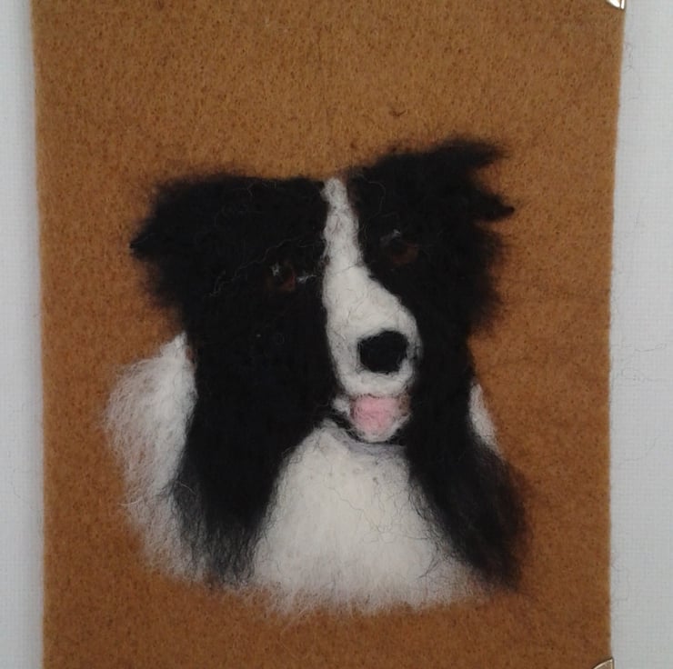 A sweet little A6 lined notebook, covered in brown felt with a needle felted Border Collie dog on the front cover. Containing 120 pages, with gold coloured book corners, this notebook is supplied in a cellophane wrapper making it an ideal gift.