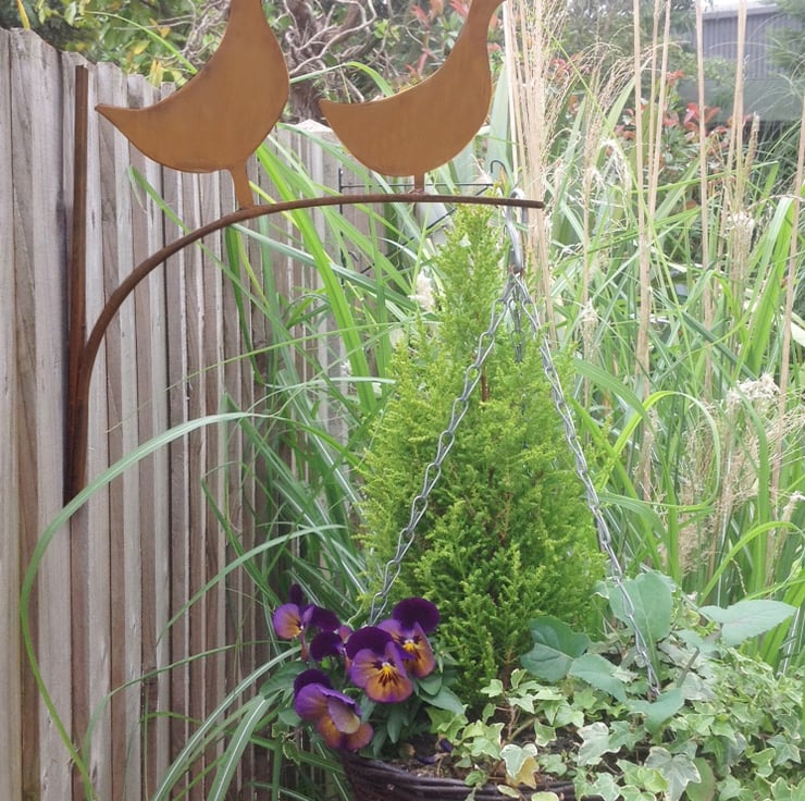 Hi, this is my hand made 2 duck hanging basket bracket. Made from solid steel, hand shaped, welded then finished off in vintage rust! The bracket is 8" (20cm) with a reach of 12" (30.5cm). With or without a basket of wonderful plants (not included) this will add humour and style to your garden.