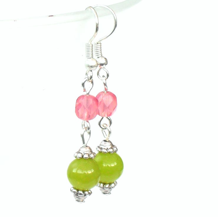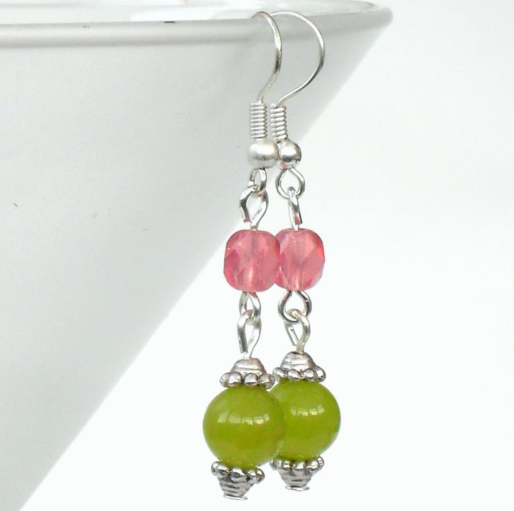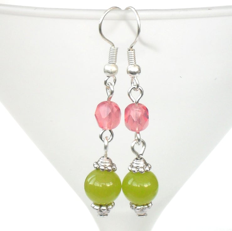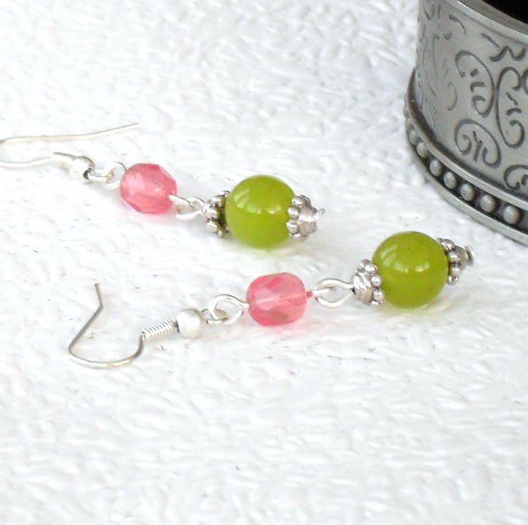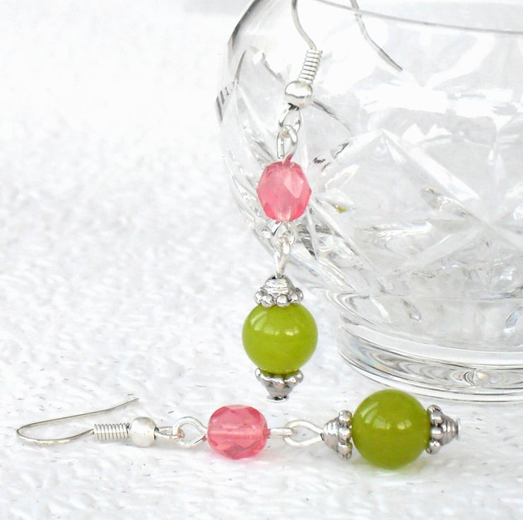 I made these vibrant earrings with round peridot semi-precious gemstones and deep peach crystal.