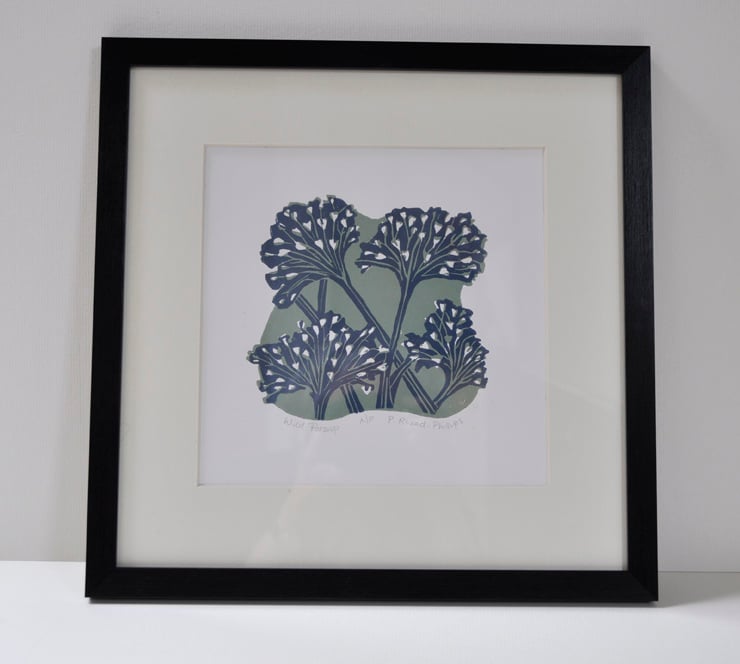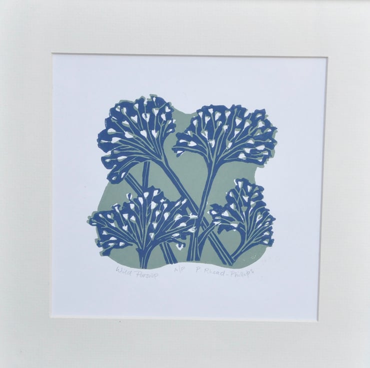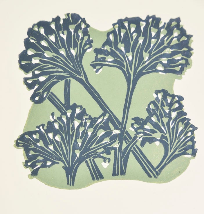 Original two colour Lino cut print. Printed on Zerkall 210 gsm paper with water soluble ink in sage green and dark blue. Each print is hand burnished.