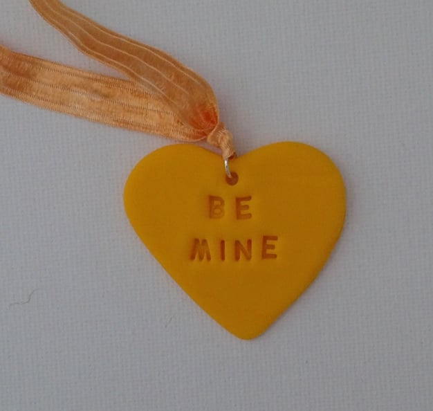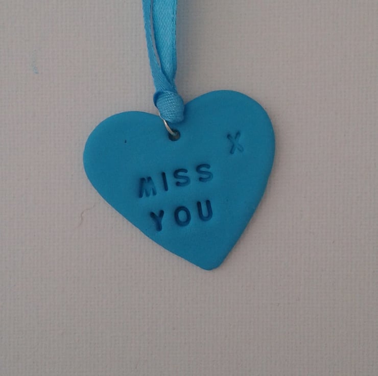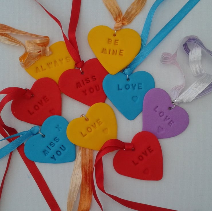 Inspired by the well known sweets these lovely little polymer clay hearts measure approx. 4.5cm and are approx. 1mm thick. They are stamped with the wording of your choice (subject to available space), some examples shown here are LOVE, MISS YOU, BE MINE. They are supplied with a co- ordinating ribbon.