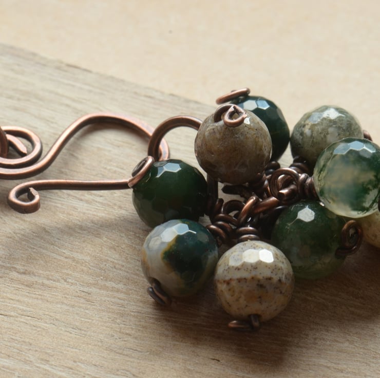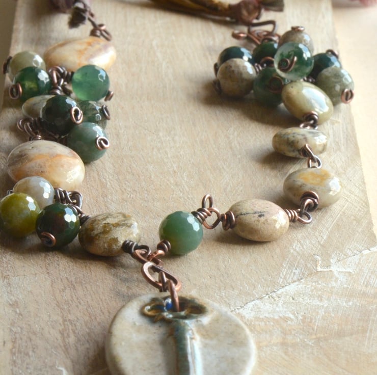 A ceramic key pendant adorns this necklace which I have teamed with a mix of gemstones, little bouquets of faceted agate beads in shades of green through to browns, opal black spot coins and lepidolite ovals. All the components including the clasp are copper, handmade by me from copper wire which I have wirewrapped around the beads, shaped to form links, oxidised to give an antique feel and polished to finish. The necklace is finished with sari silk ribbon in lovely deep shades of grey through to purples and yellows.