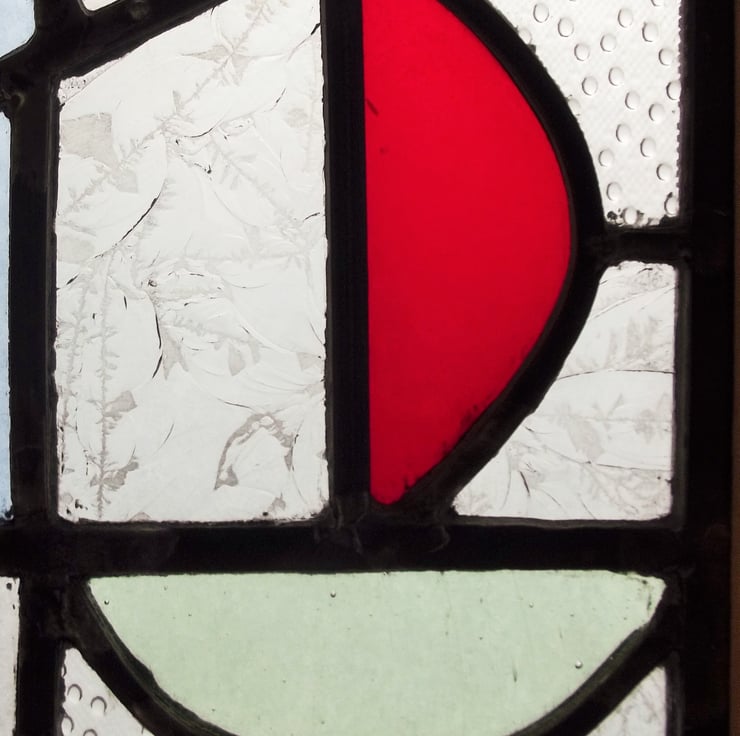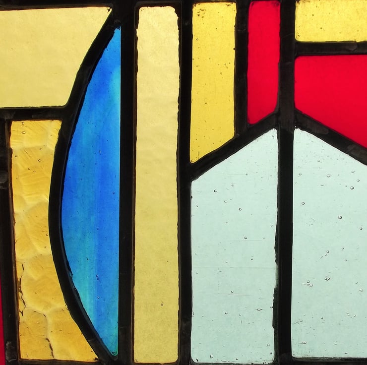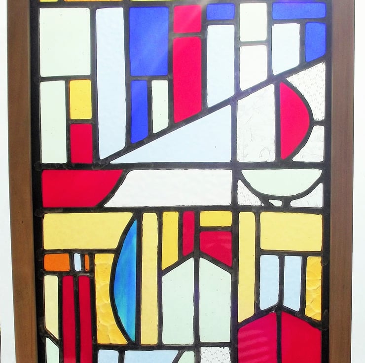 A lovely, unique stained glass panel made with the jewel rich colours of ruby red, deep blue and yellow glass. This is an abstracted view of the village of Kingswear, in South Devon and if you look closely you can see boats and houses and the steep triangular harbour wall. All the glass used is reclaimed waste glass from a local teaching studio and it is made using traditional leading techniques.