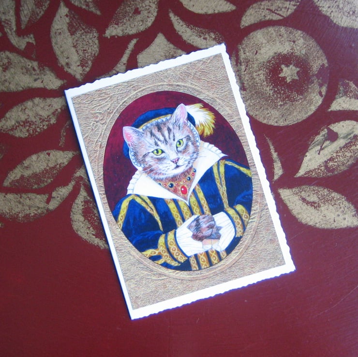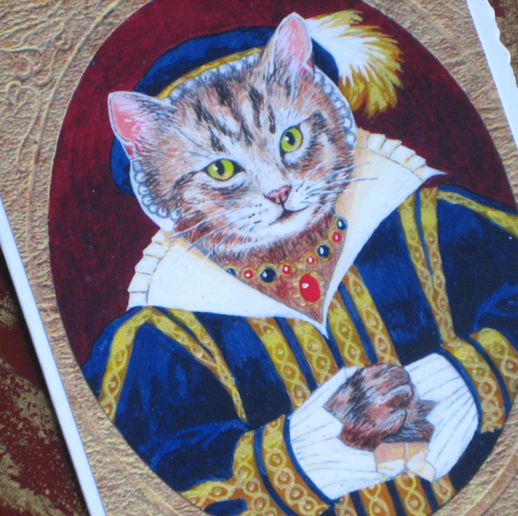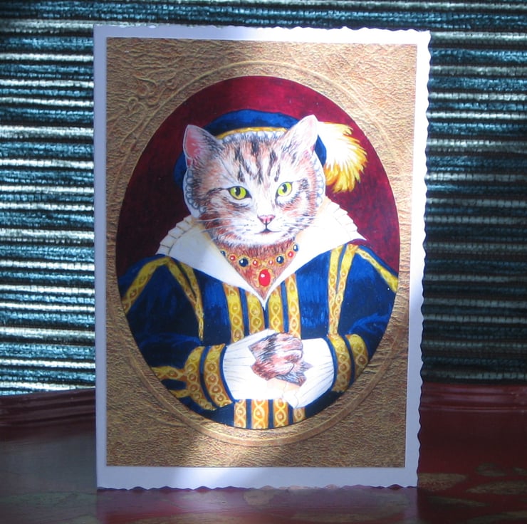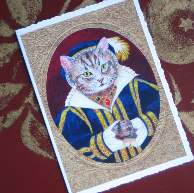 This beautiful Tudor lady has been portrayed in acrylic paint. Entirely my own work, it is exclusive to The Owl and the Pussycat. The image, printed on photo paper, has been mounted on a white, A6 deckle edged card and comes with a white envelope. Blank for your own message, it is ideal for a birthday, or to say thank you, good luck, congratulations or well done. Perfect for someone who likes history, art and animals.