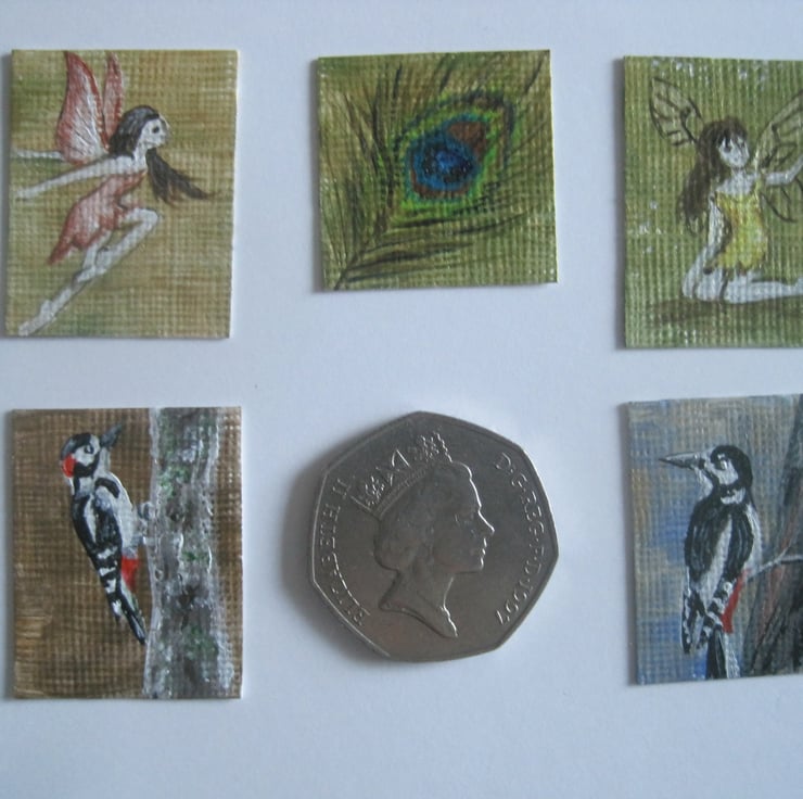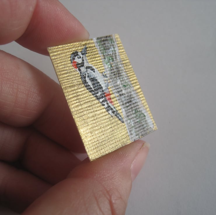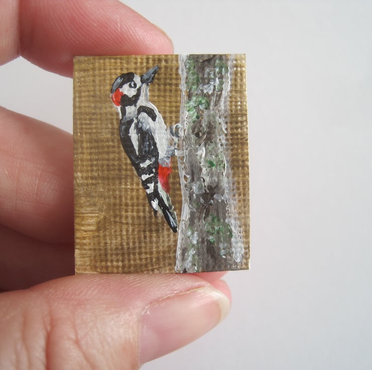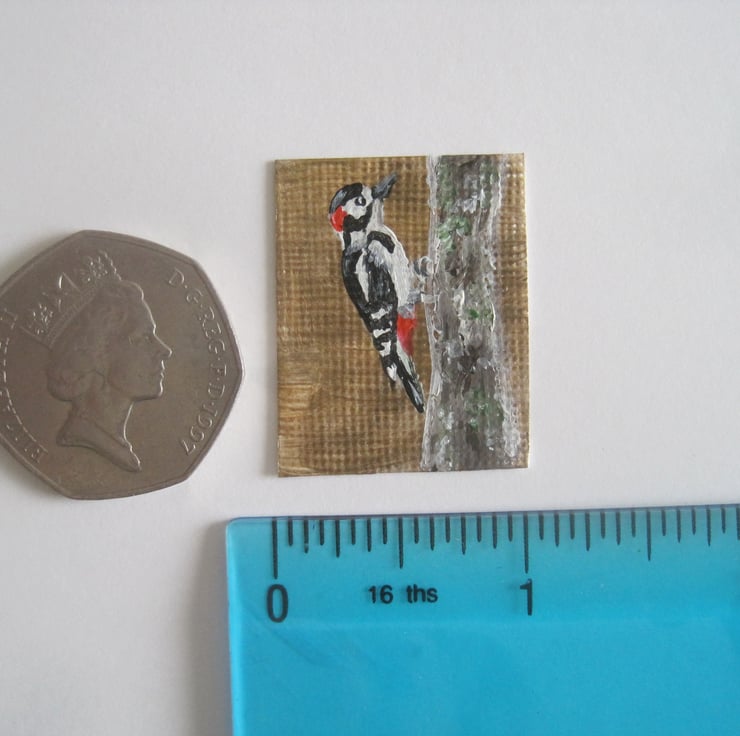 This wee painting measures just 1 x 1.5 inches, and features a Greater Spotted Woodpecker.