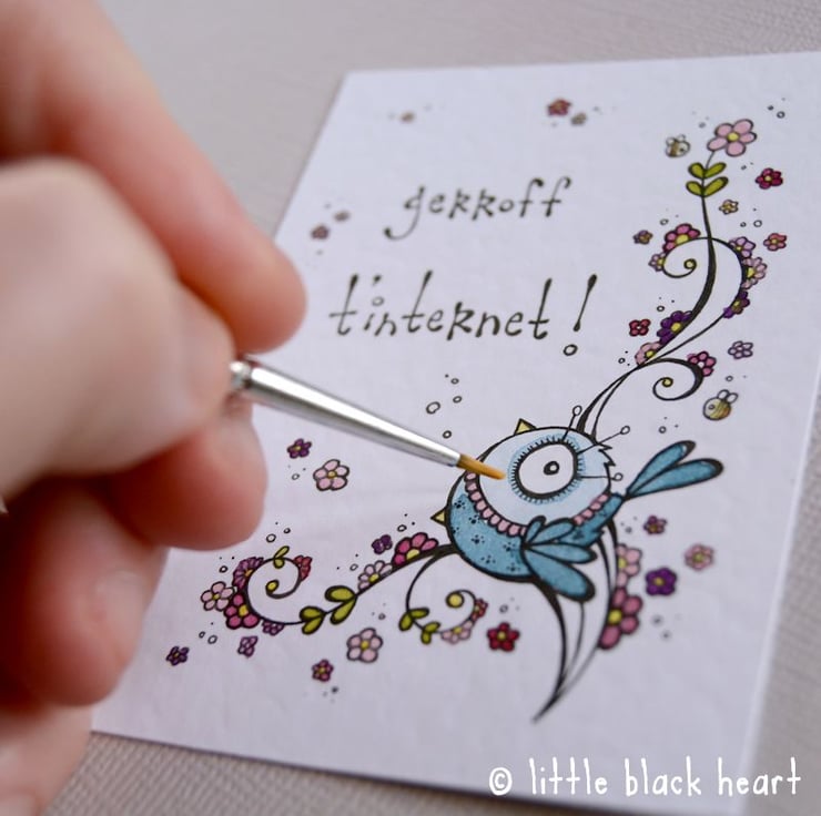 original artwork in artists pens and watercolour paints, on textured white 300gsm cardstock. drawn with a tiny 0.05 nibbed pen, and carefully painted with just the very tip of a tiny paintbrush!