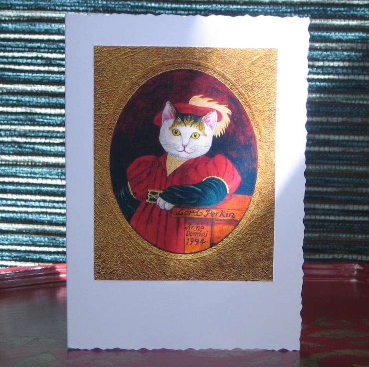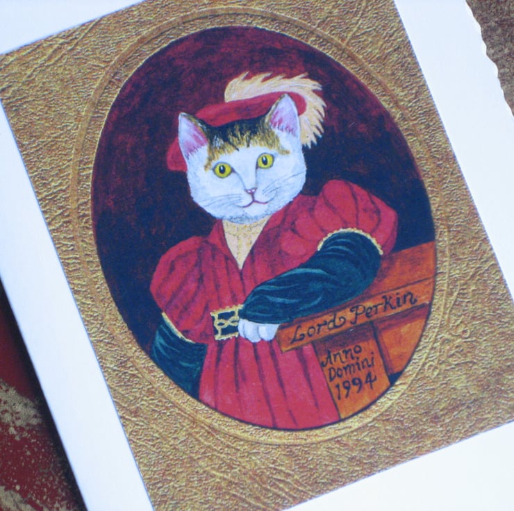 Here is dashing young Lord Perkin posing nonchalantly for the artist. Printed on photo paper, the image has been mounted on a white A6 deckle-edged card, blank for you own message. Exclusive to The Owl and the Pussycat. Supplied with a white envelope it is perfect for saying Thank you, Well Done, Happy Birthday, Good Luck or Congratulations. For a lover of history, cats or miniature paintings.