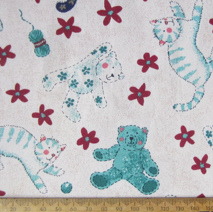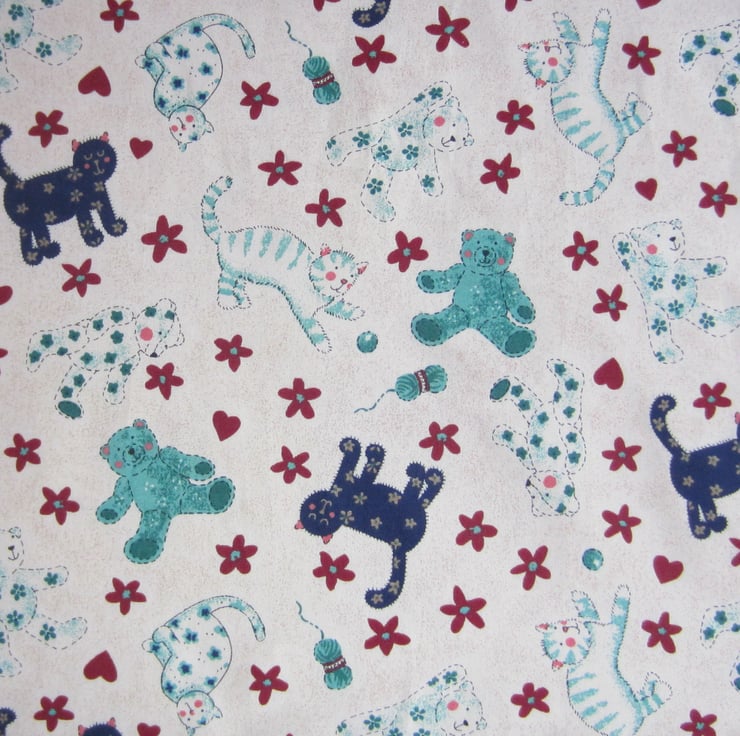 Cats, bears, flowers, hearts and balls of wool in jade green, navy blue and maroon on a light fawn background. Fat quarter measures 48 cm x 56 cm. To give an indication of the size of the cats and bears, the navy blue cats measure 5.5 x 4.5 cm
