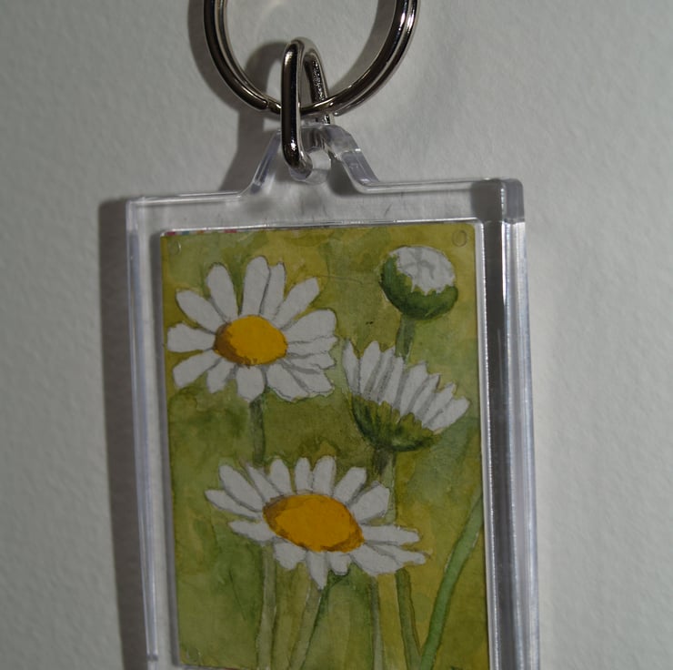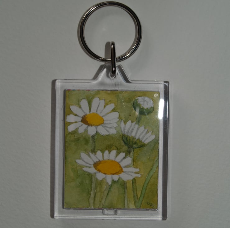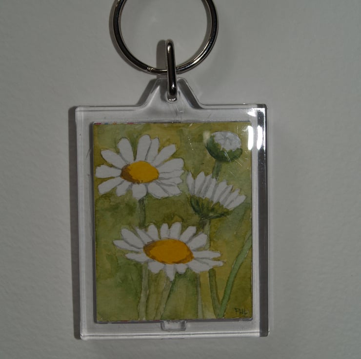 An original watercolour painting which can be carried with you wherever you go! I have painted a little Daisy watercolour measuring 45mm x 35mm and encased it in a keyring. The painting has been created onto watercolour paper using Artist's Quality paints and I have initialled it in the bottom right-hand corner.
