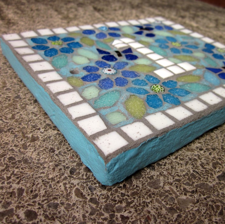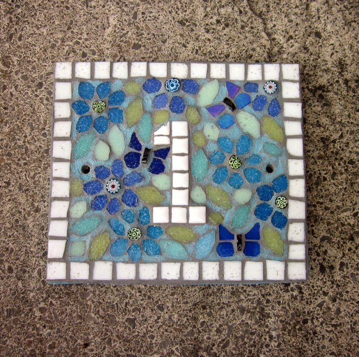 The idea for this house number plaque was to create a mosaic that had the look of a liberty style fabric. The plaque base is handcut with handpainted sides, and two screw holes. The same paint is used roughly on the mosaic design to help create the vintage fabric look. This colour version has turquoise and blue flowers, with iridescent blue butterflies that shine with metallic colours, and shades of pastel green leaves, finished with a light sky blue paint.
