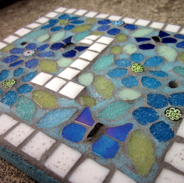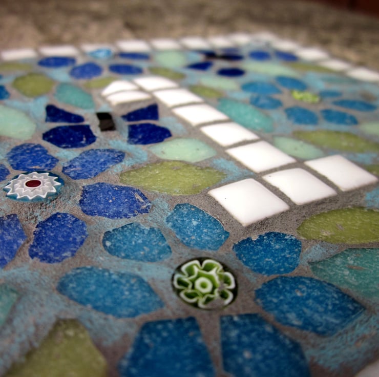 A handcut weatherproofed base with a mosaic made with vitreous glass tiles and finished in a light grey grout designed to repel algae and mold, then overpainted with weatherproof paint. Size - For single numbers 14.5cm wide x 12.5cm tall x 1.5cm deep.