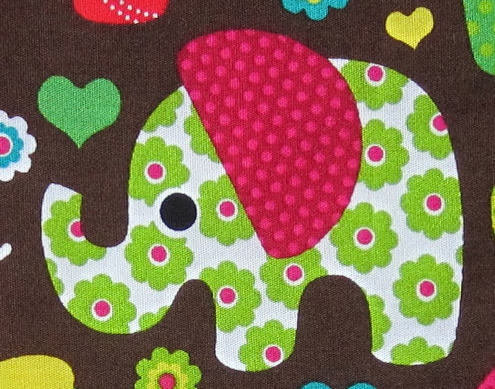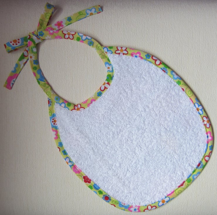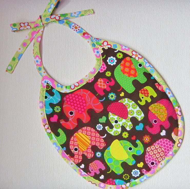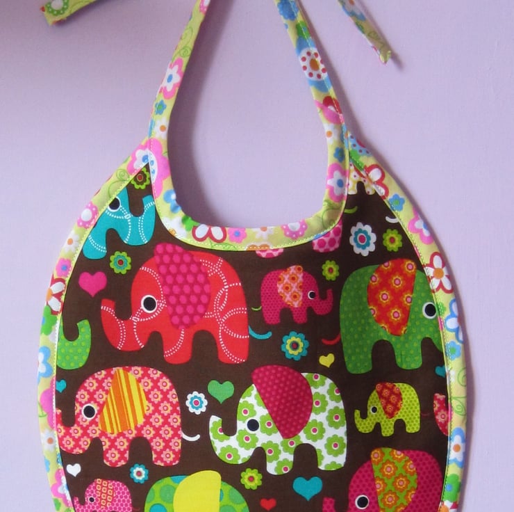 Babies bib in lovely bright 1960's style elephant fabric. Edged in floral bias binding and backed with white towelling. Suitable for babies aged about 6 to 12 months. It measures 23 cm wide and 27 cm long. Fastens with a bow at neck.