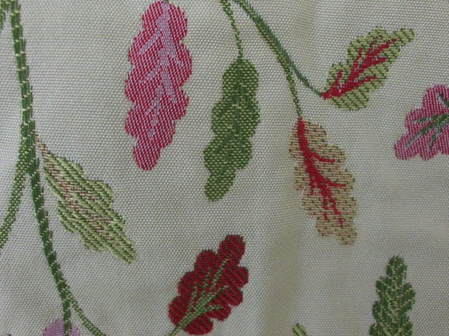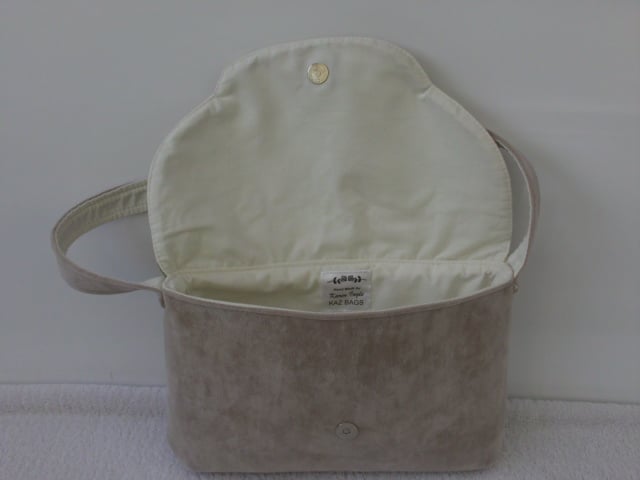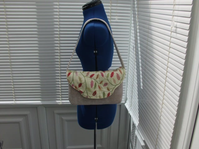 The main body of this bag is made from faux suede which is a rich cream colour to a very light fawn its a soft fabric . The flap over on this bag is in a cream fabric with trailing leaf design that looks like embroidery of pinks,reds, green and gold on light green streams .All seams are top stitched . Darts at the bottom to make base of bag and give room inside It is lined in a cream cotton fabric with a patch pocket .