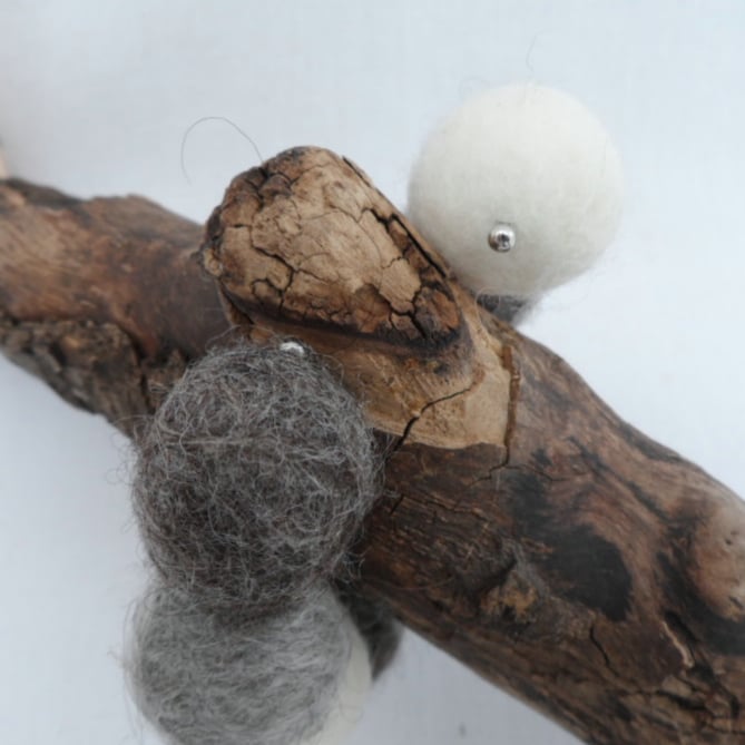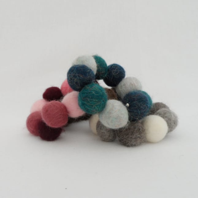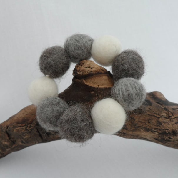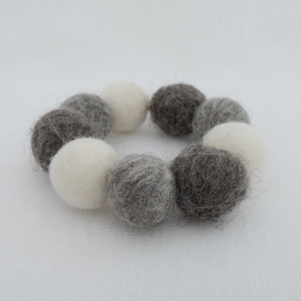 A quirky, modern bracelet in gorgeous shades of grey and white corriedale wool. It is constructed from 20 mm felted polystyrene balls threaded on a memory wire bracelet. The wool is beautiful and soft and the bracelet as a whole is extremely light.