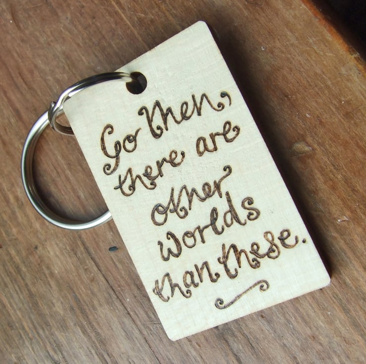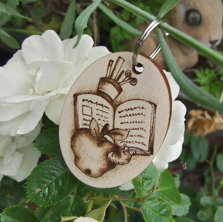 Pyrography is a method of decorating items using a heated tool. This listing is for a wooden keyring decorated an apple, a bookworm and some books and stationery. It is made and ready to post. I can put a name and/or date etc. on the reverse. Please see the images for the many variations. Find me on facebook to see my full gallery.