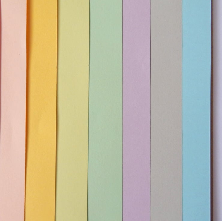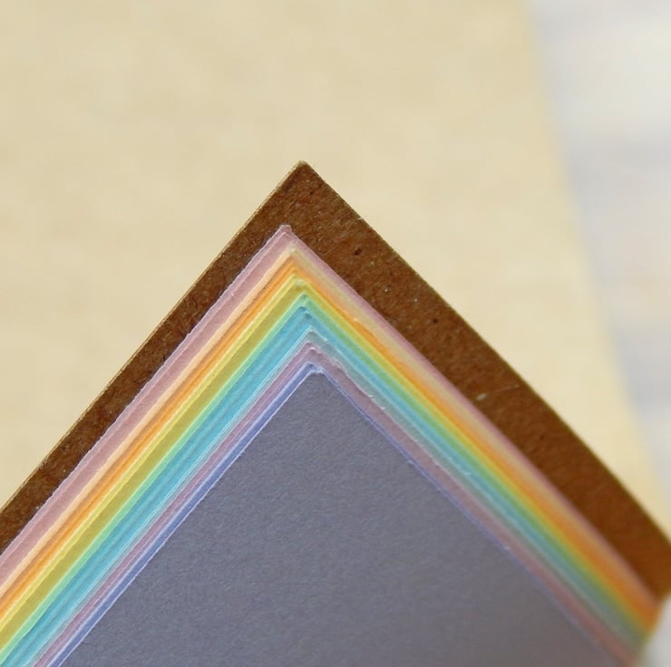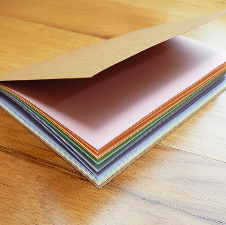The book contains 32 pages (64 sides) of paper, four each of eight different pastel shades, arranged in a rainbow.