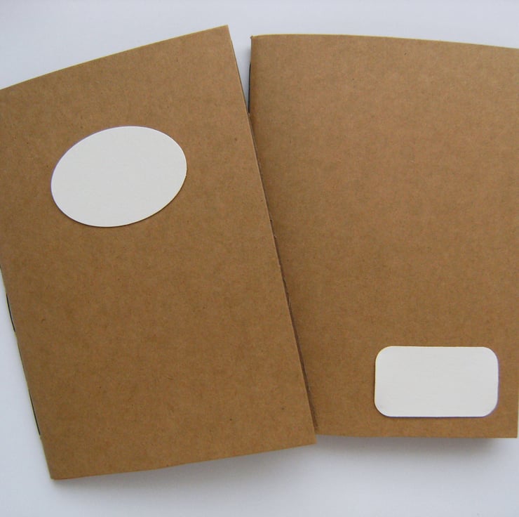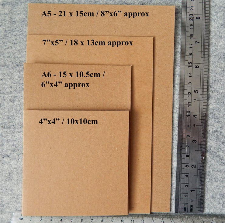 My Kraft covered notebooks are very popular and I have been expanding the range. I now offer these in four sizes: A5 (21x15), Narrow A5 (21x11), A6 (15x10), 7"x5" size, also occasional special little books of 4" square.