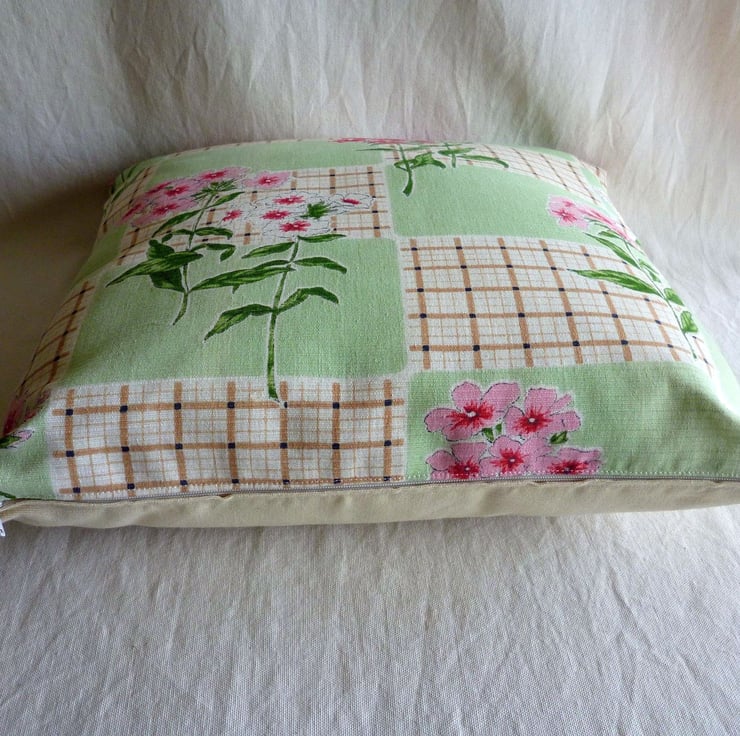 This cushion cover is made from a piece of vintage cotton fabric which has been reclaimed from a curtain. The fabric, which is in good reclaimed condition, features pretty pink flowers and pale green rectangles on an ivory/cream background and dates from the 1950s. The back of the cushion cover is made from plain cream cotton twill and the cover fastens with a zip at the bottom. The cover is made to a high standard and all internal seams are overlocked for strength.