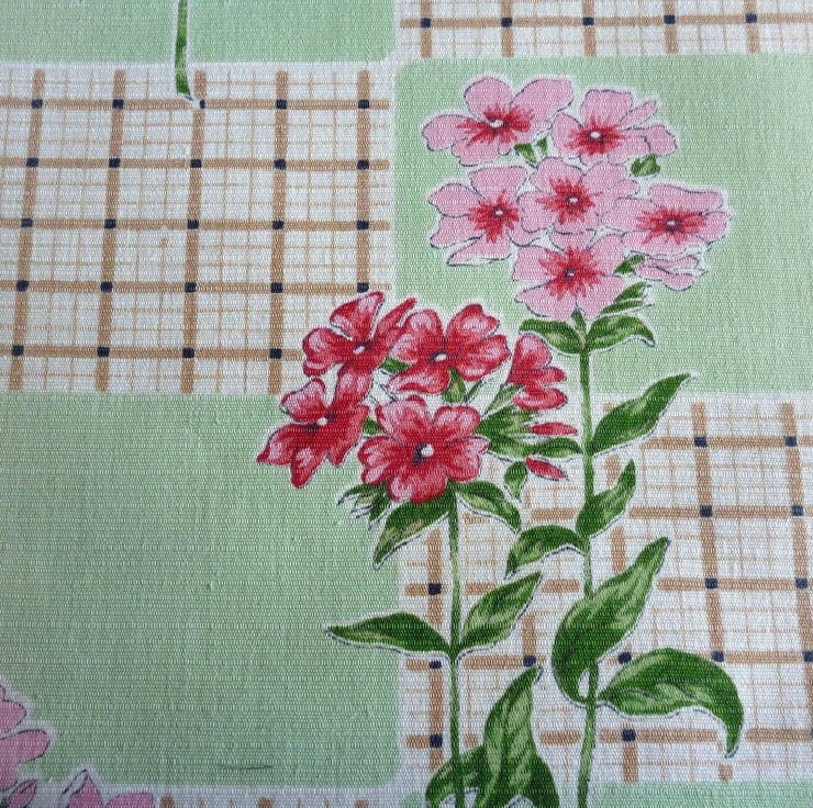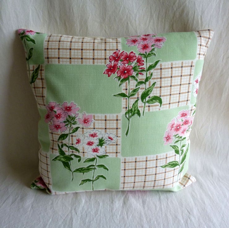 This cushion cover is made from a piece of vintage cotton fabric which has been reclaimed from a curtain. The fabric, which is in good reclaimed condition, features pretty pink flowers and pale green rectangles on an ivory/cream background and dates from the 1950s. The back of the cushion cover is made from plain cream cotton twill and the cover fastens with a zip at the bottom. The cover is made to a high standard and all internal seams are overlocked for strength.