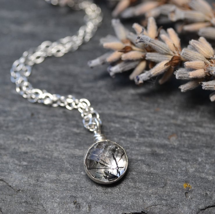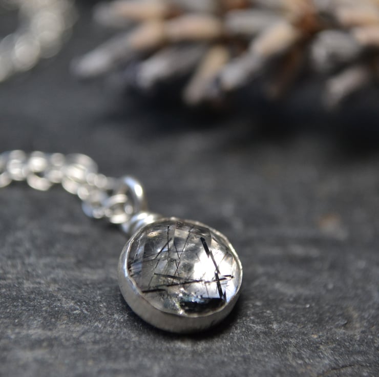 Monochrome pendant - Lovely 8mm tourmalinated (sometimes called rutilated) quartz checkerboard cut cabochon stone, set in sterling silver and hanging from a sterling silver 18" chain.