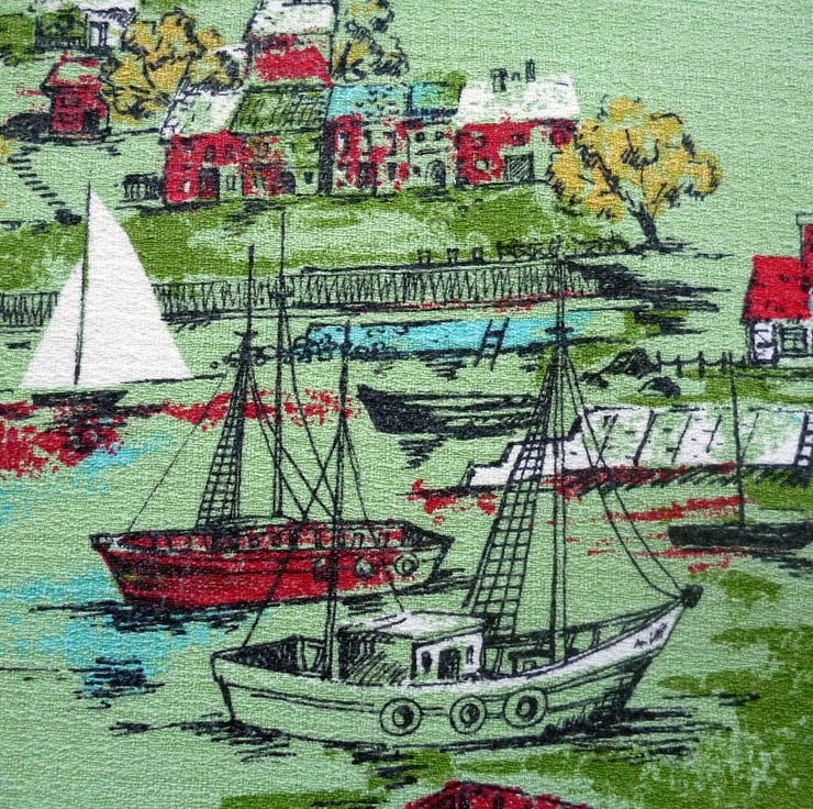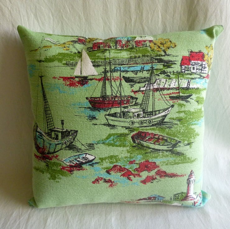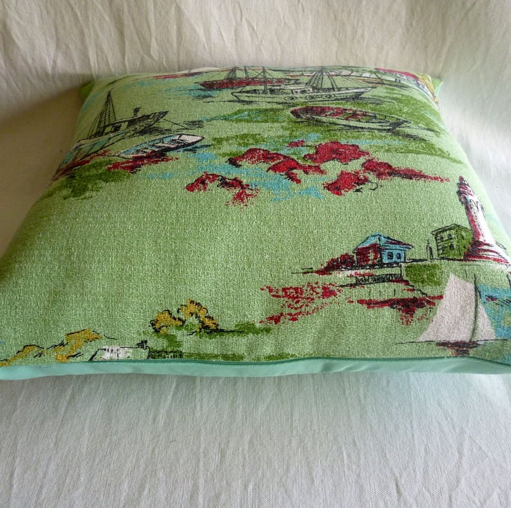 This cushion cover is made from a piece of vintage cotton barkcloth fabric which has been reclaimed from a curtain. The fabric, which is in very good reclaimed condition, features a pretty fishing village scene on a pale green background and dates from the 1950s. The back of the cushion cover is made from plain green cotton twill and the cover fastens with a zip at the bottom. The cover is made to a high standard and all internal seams are overlocked for strength.