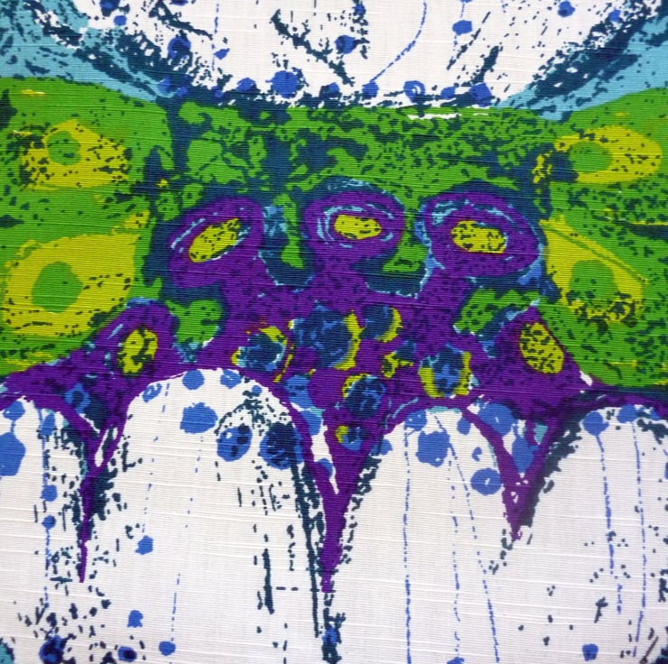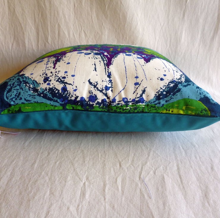 This cushion cover is made from a piece of reclaimed vintage fabric and features a bold and iconic design called Lago designed by Saini Salonen for the Swedish company Boras. The fabric,which is in excellent reclaimed condition, features a design of stylised flowers in shades of green, purple and white on a teal background and dates from the late 1960s. The back of the cushion cover is made from plain teal cotton twill and the cover fastens with a zip at the bottom. The cover is made to a high standard and all internal seams are overlocked for strength.