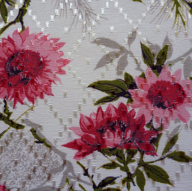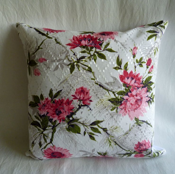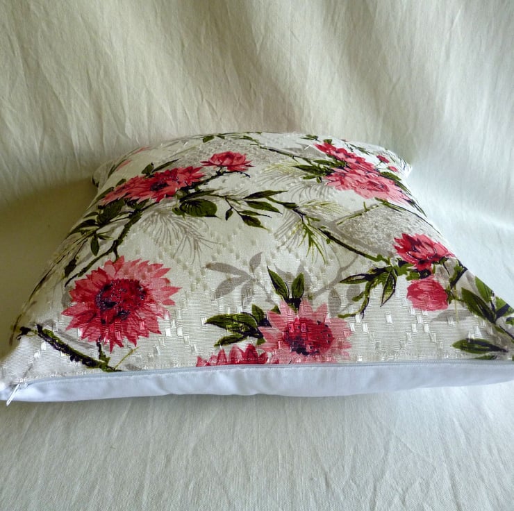 This cushion cover is made from a piece of unused vintage embossed satin fabric which features a pretty design of pink flowers and leaves on a white background and dates from the 1950s. The back of the cushion cover is made from plain white cotton twill and the cover fastens with a zip at the bottom. The cover is made to a high standard and all internal seams are overlocked for strength.