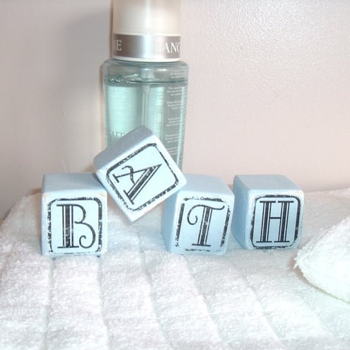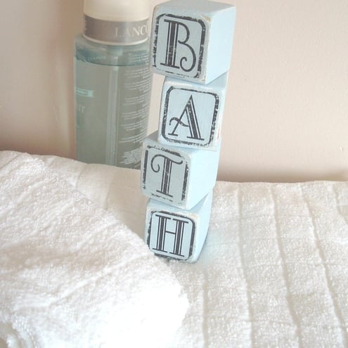set of 4 shabby chic blocks with the letters of your choice on, each block is approx 4 X 4 X 4 CM cubed. baby blue lovely aged appearance great shelf sitters, any 4 letter word can be put on please advise if you would like something different, many thanks