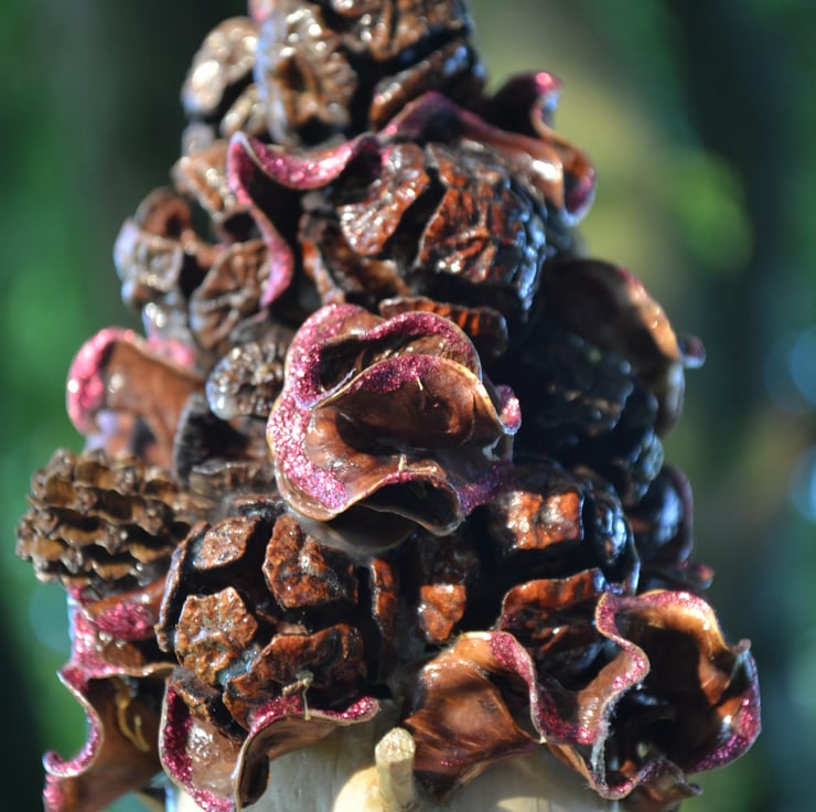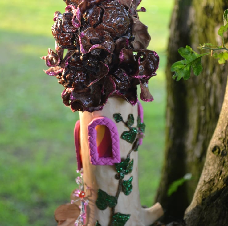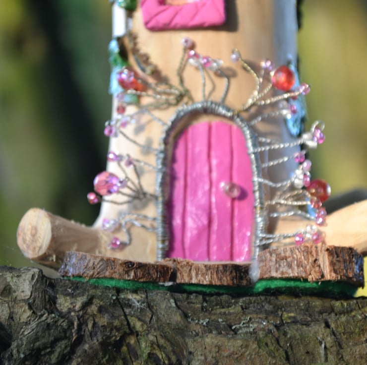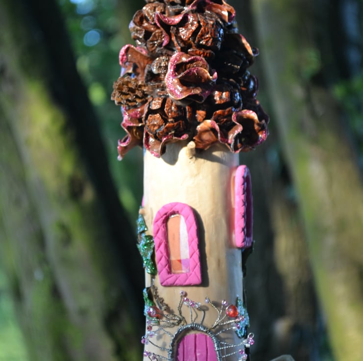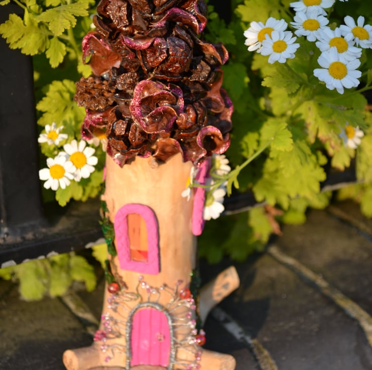 Beautiful hand made Fairy House made using recycled wood from last year's unsold Christmas trees from a local provider. This fairy house is approximately 12cm wide (at it's widest point) and 25cm high. The house has lots of added little details - seed pods with glittered edges and unusual cones for the roof, hot pink window frames & door. The door also has a lovely beaded surround and the house has delicate green ivy detail up the sides, all of which make it a truly unique piece. I hope this fairy house brings as much joy as it gave me making it.