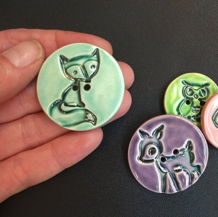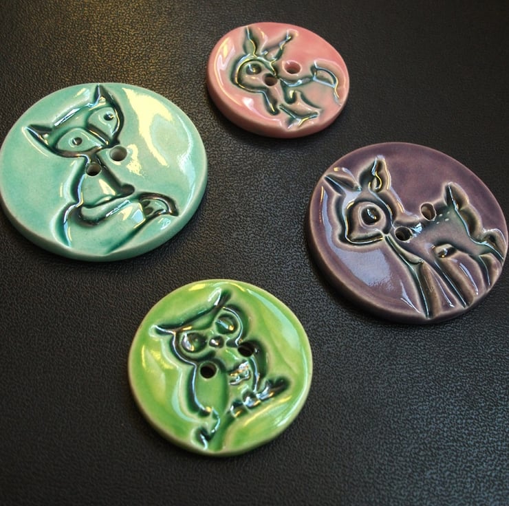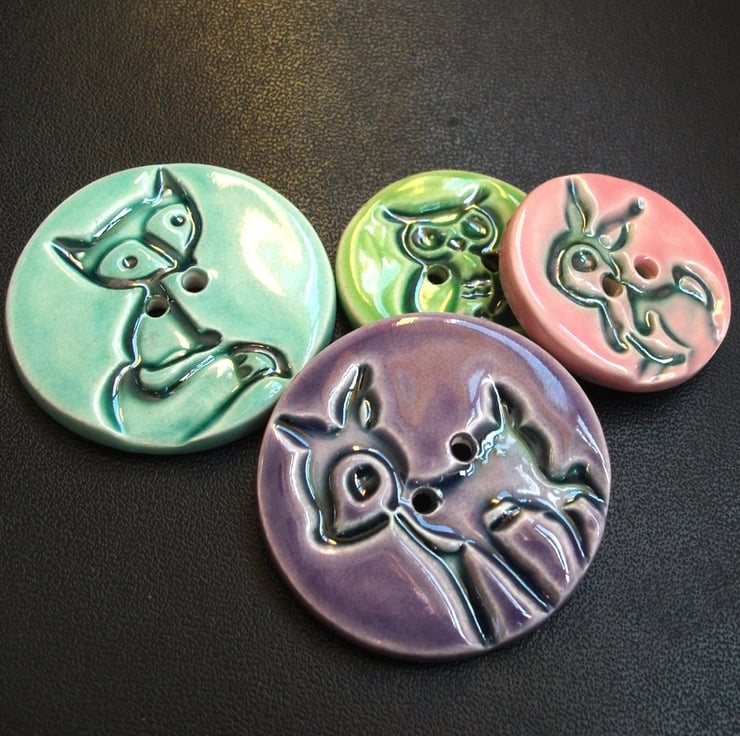 This set of four cute little buttons are made from white earthenware clay, embossed (from commercially available images) and glazed to 1100 degrees, so nice and strong.