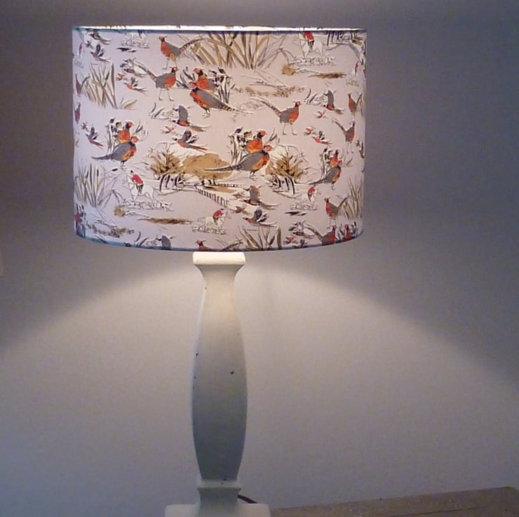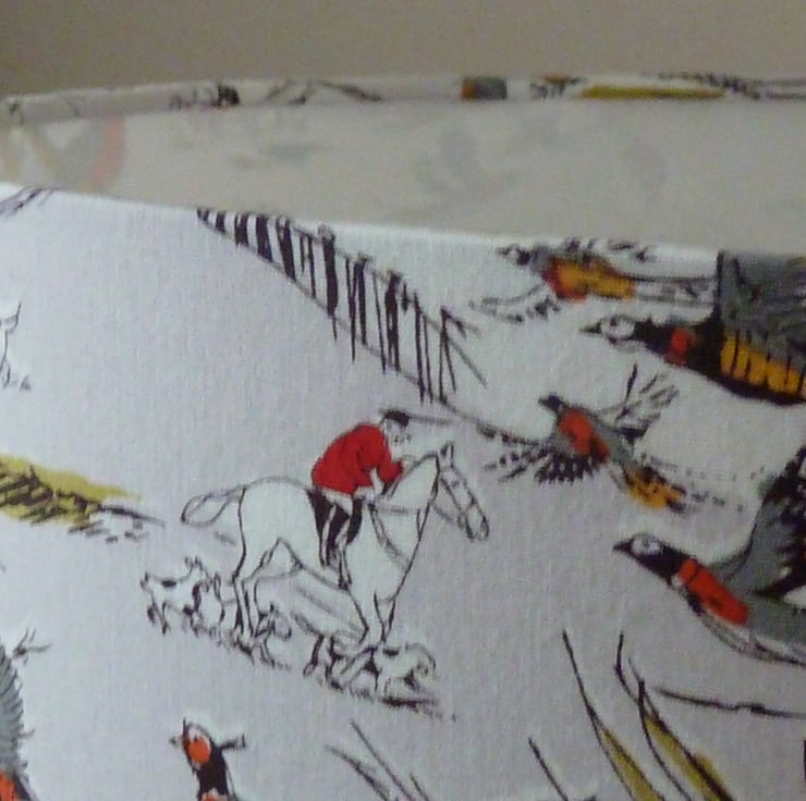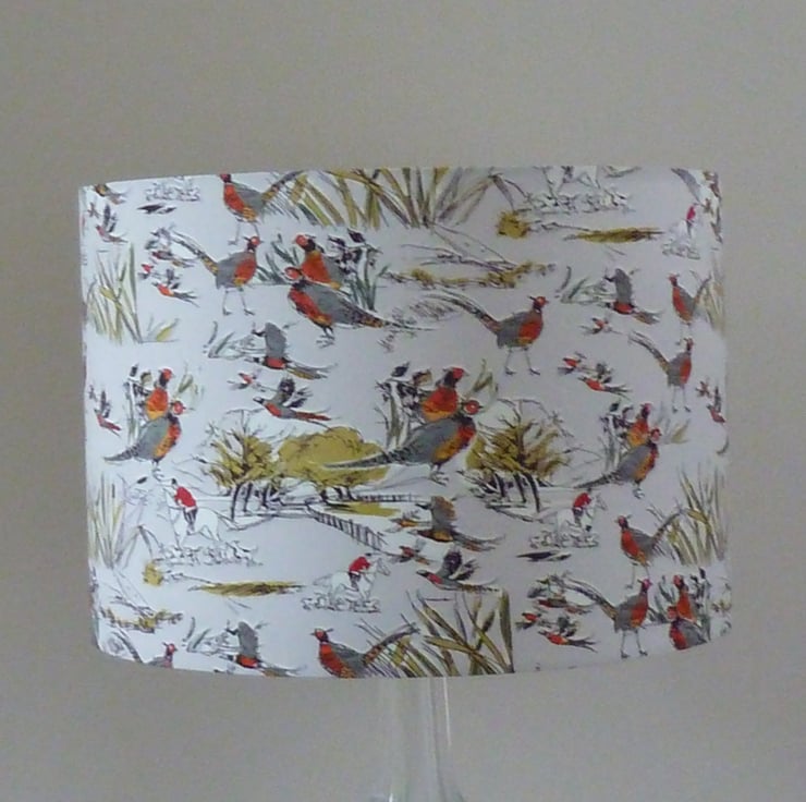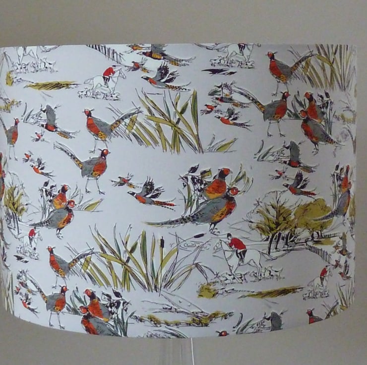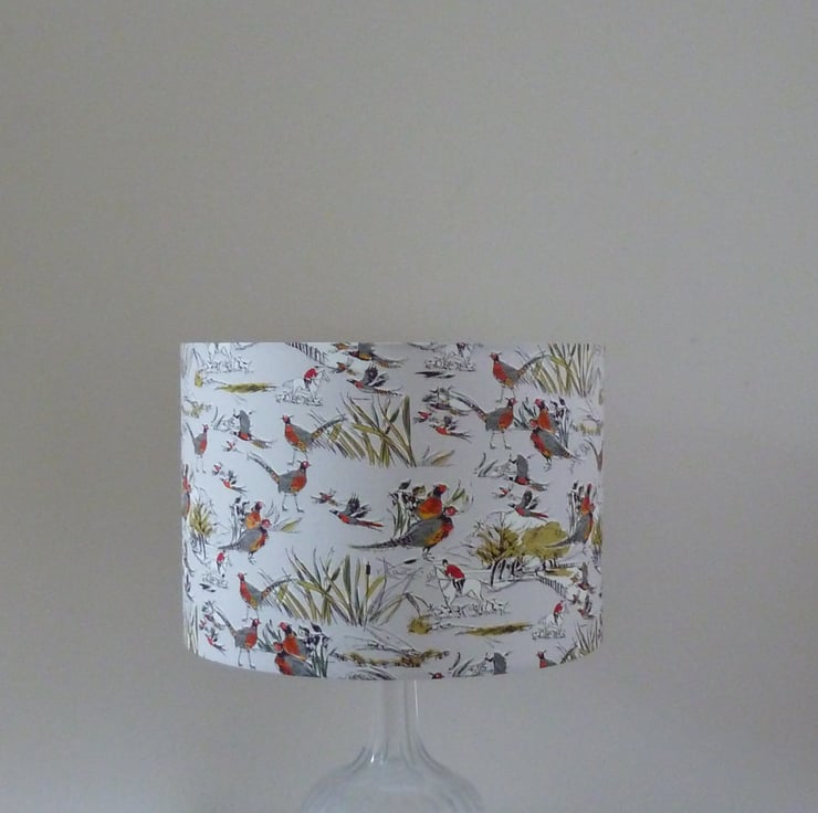 Drum lampshade 30cm covered in cotton fabric showing pheasants & horses & hounds