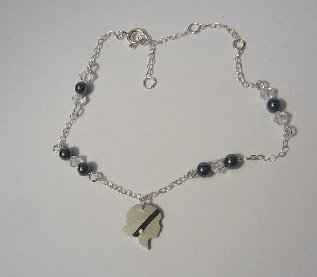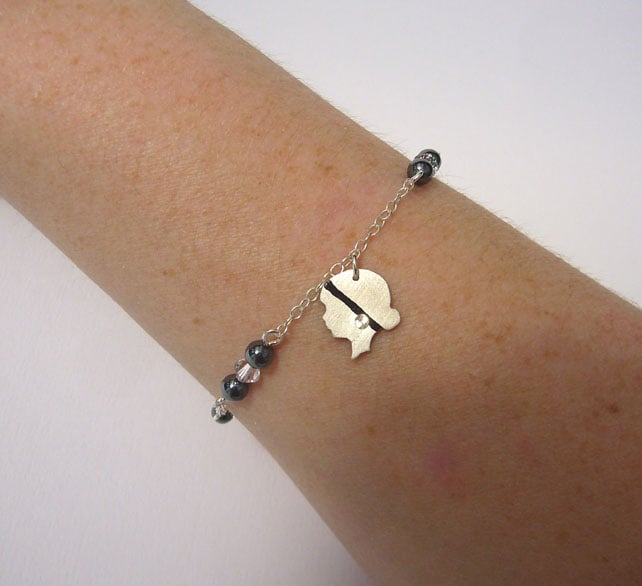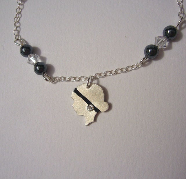 This is a girl with a hair band & crystal earring, hand cut out of 1mm thick sterling silver. She is approximately 1.3cm wide and 1.4cm high and has her hair band painted on both sides with enamel paint. She is attached to a sterling silver chain with a variety of haematite and crystal beads, approximately 21cm long.
