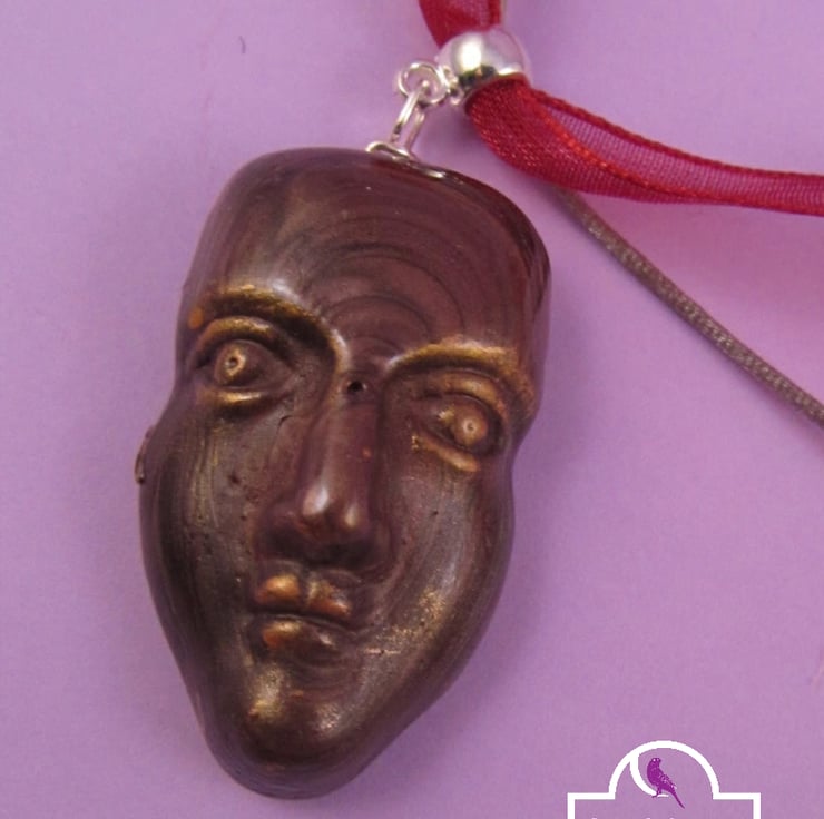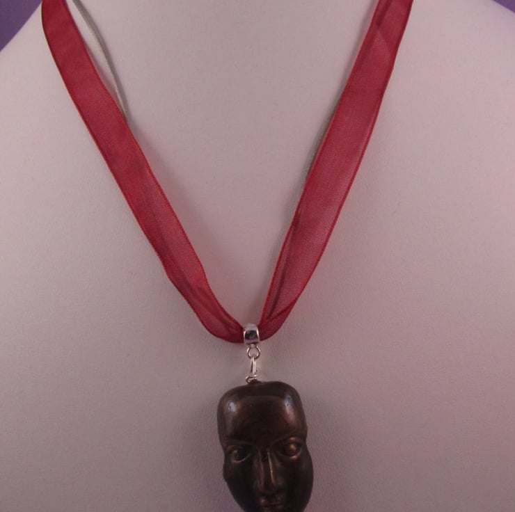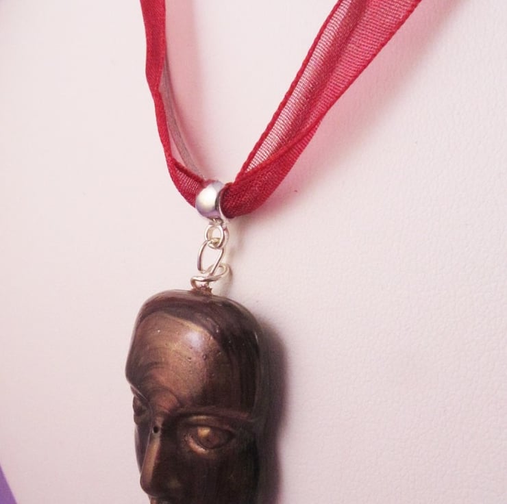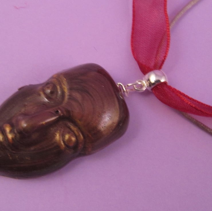 This is a classic brown face jewel enamel pendant ribbon necklace. It is created using a mixture of jewel enamel (UTEE), gold gleam, silver plated copper, satin cord and organza ribbon. It is a versatile piece of jewellery that can be worn either way round. It would look great with jeans.