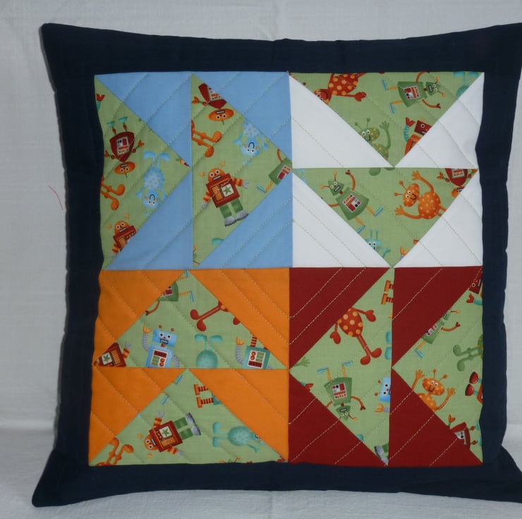 This is a traditional design, the background to each large triangle is in a colour picked from the robot fabric so that it co ordinates perfectly and the border is plain navy . The backing is navy blue and is an envelope style with contrasting trim. The front has been quilted in a square pattern in green thread.