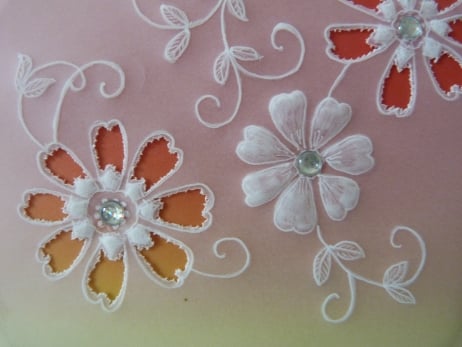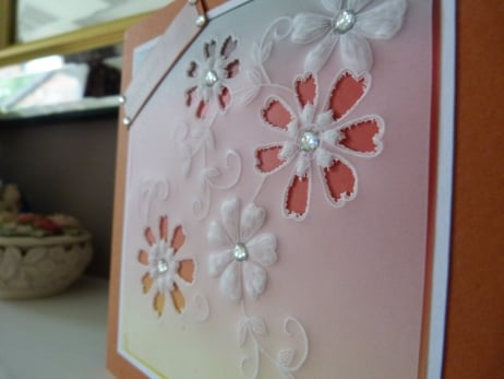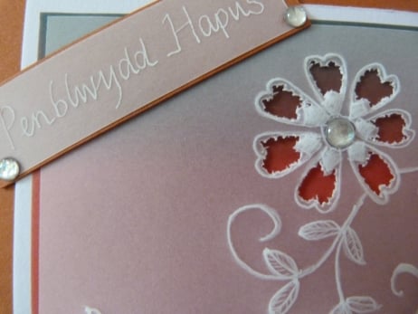 A pretty design of daisies cut, embossed and pierced from parchment, mounted onto shaded vellum ranging from orange to yellow. The centres of the daisies finished with pearl gems. Mounted onto white card and then onto burnt orange quality card, Finished off with pemblwydd hapus.